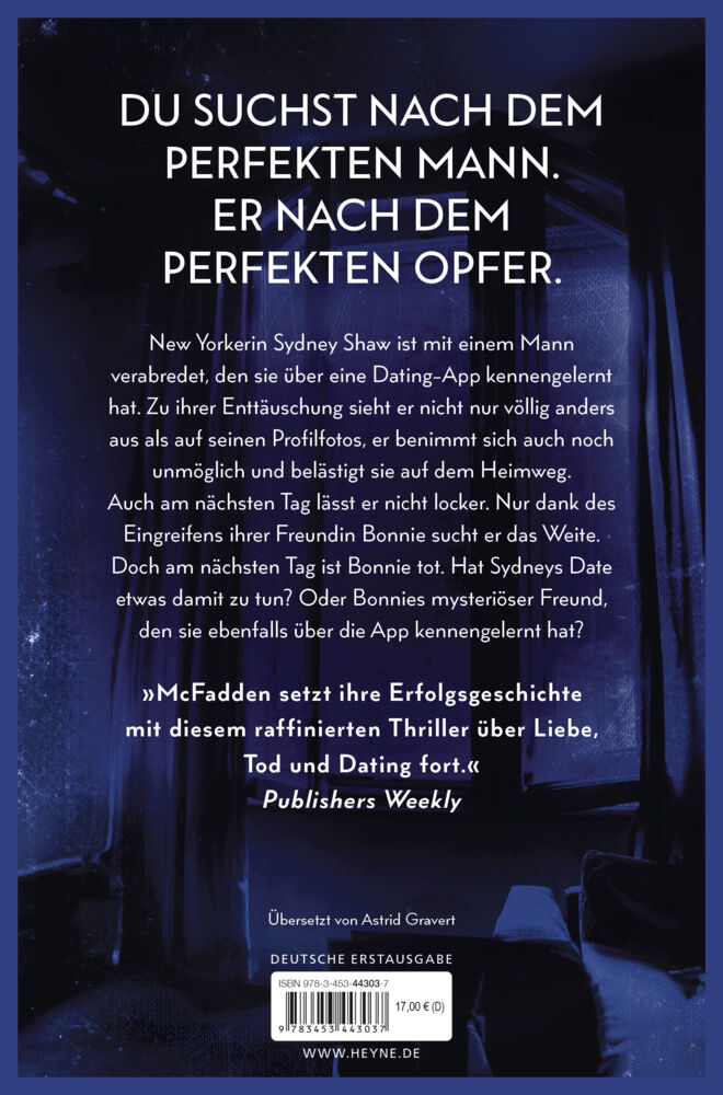 Du suchst nach dem perfekten Mann. Er nach dem perfekten Opfer. Sydney Shaw hatte immer Pech mit ihren Dates. Bis sie Tom traf. Tom scheint perfekt: Er ist charmant, attraktiv und arbeitet als Arzt in einem Krankenhaus. Dann erschüttert der brutale Mord an ein...