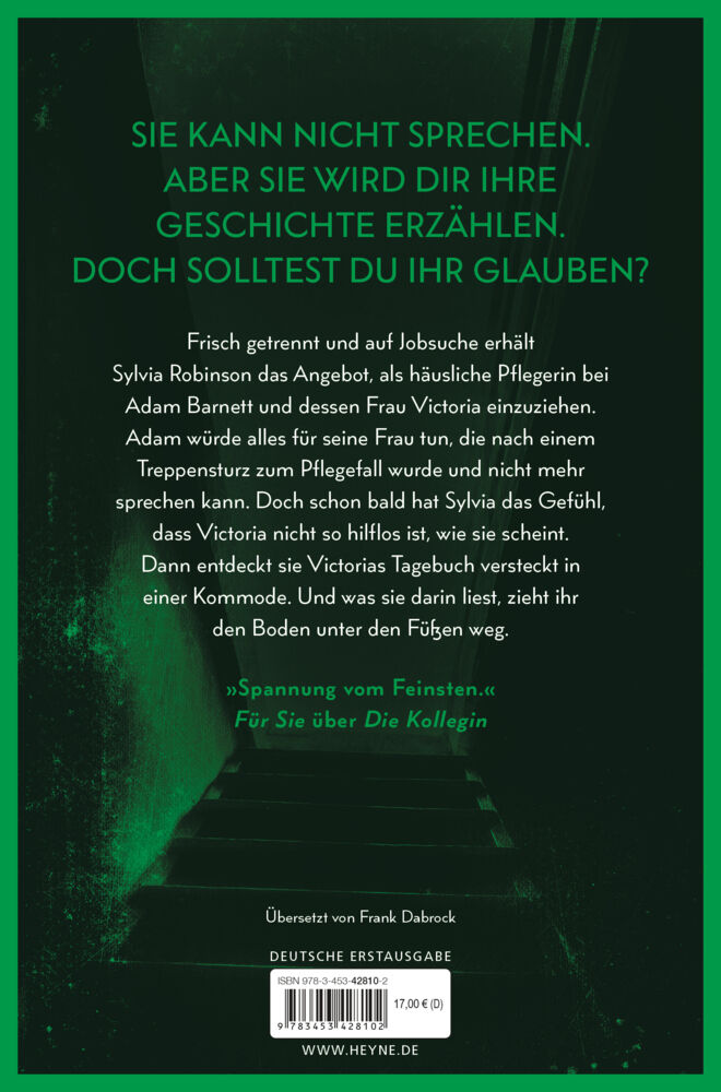 Sie hatte einen Unfall. Sie kann kaum sprechen. Sie ist die Ehefrau eines Mannes, der alles für sie tut. Doch das ist nicht die ganze Wahrheit Sylvia Robinson wird im Haus der Barnetts als private Pflegekraft eingestellt. Nach einem Unfall benötigt Victoria Ba...