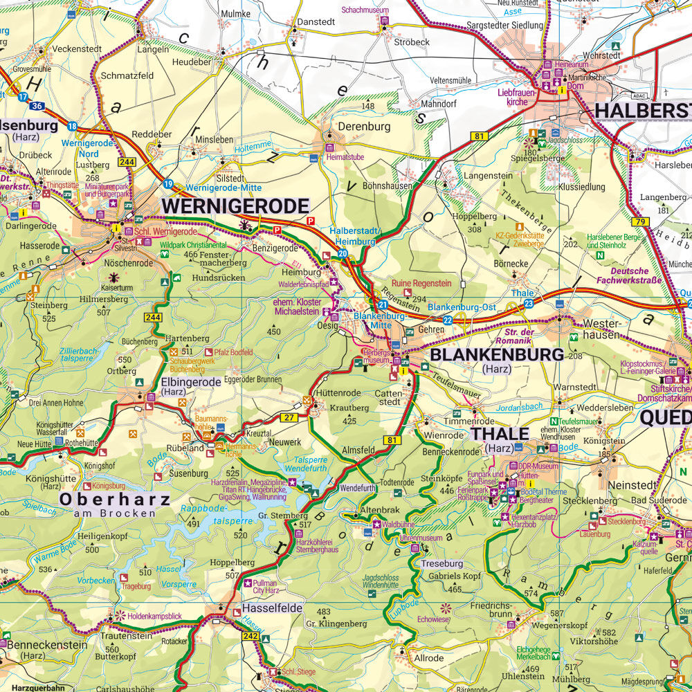 Freizeitkarte Harz Informationen zur Ausflugskarte Harz Maßstab 1:140.000 Auto- und Straßenkarte Sehenswürdigkeiten, Naturparks Landschaftlich schöne Strecken Touristische Informationen Wasserfest und reißfest ca. 89 x 60 cm Sehenswürdigkeiten Wasserfest und r...