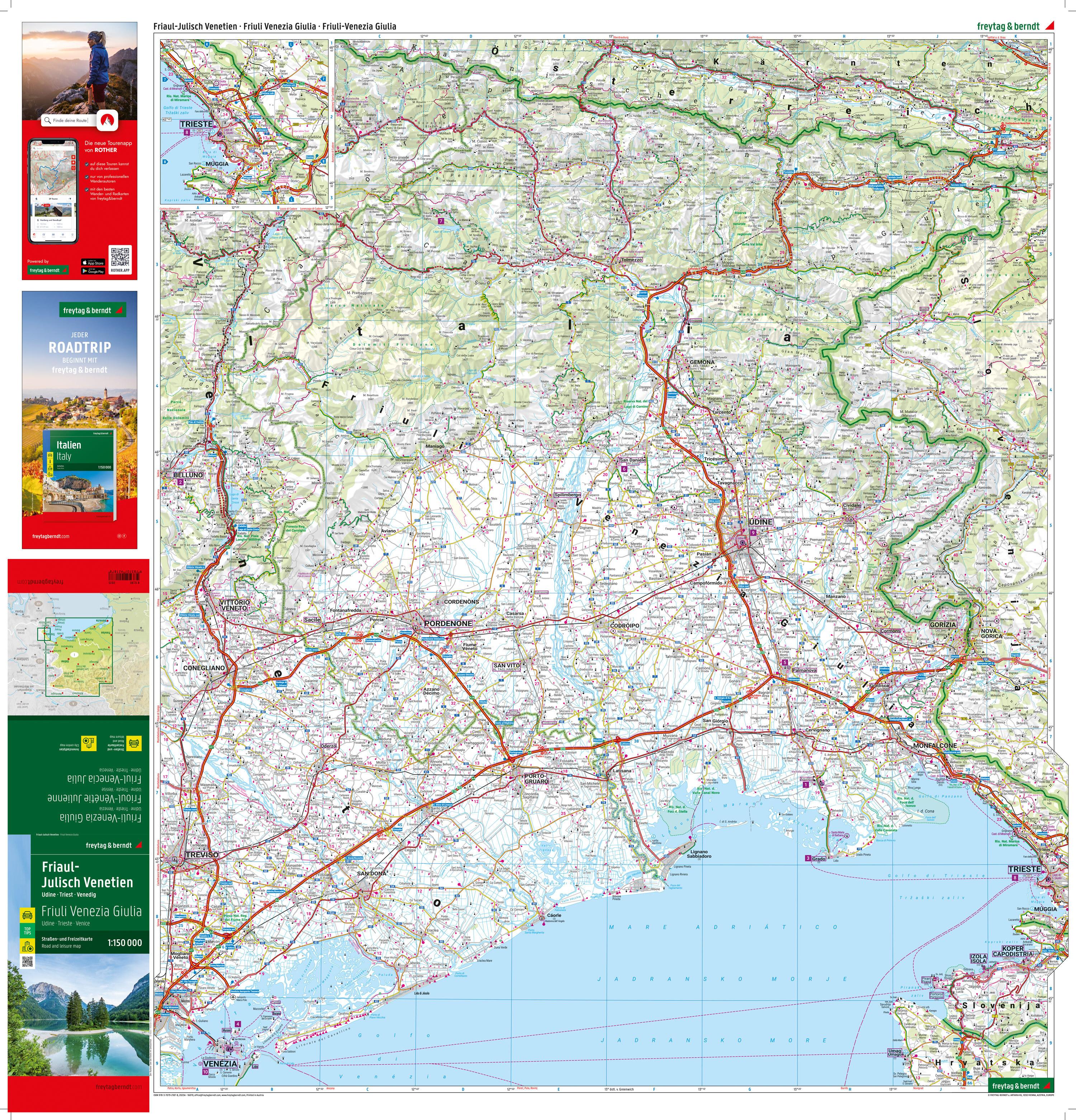 Die Straßen- und Freizeitkarte Friaul-Julisch Venetien im Maßstab 1:150.000 enthält viele nützliche Informationen für eine Reise in die malerische norditalienische Region. Das dichte Straßennetz ist exakt abgebildet, landschaftlich schöne Straßen sind farblich...