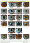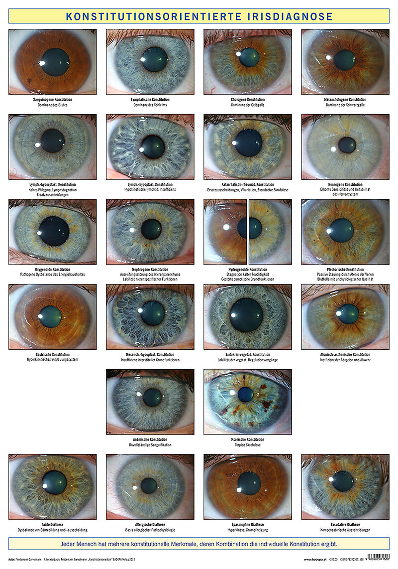 Die Tafel basiert auf dem Fachbuch Konstitutionsmedizin von Friedemann Garvelmann und zeigt mit repräsentativen Irisfotos die 18 sicher im Auge erkennbaren Konstitutionen und vier Diathesen in ihrer augendiagnostischen Darstellung. Ergänzt wird dies durch die ...