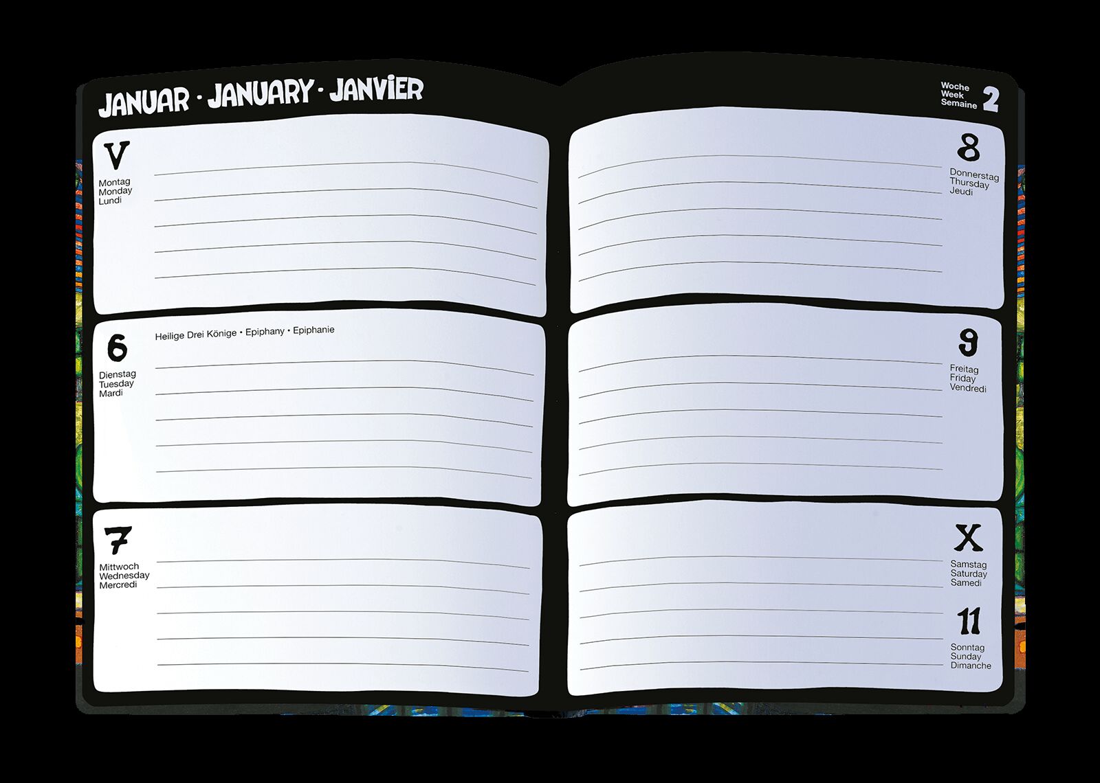 Format: 11,2 x 15,4 cm 160 Seiten inkl. 16 Farbreproduktionen Dreisprachiges Kalendarium: DE, EN, FR Umschlag mit Glanzfolienprägung, Lesebändchen, abgerundete Ecken, Gummiband zum Verschließen Die Hundertwasser Agenda 2026 besticht durch eine hohe Funktionali...