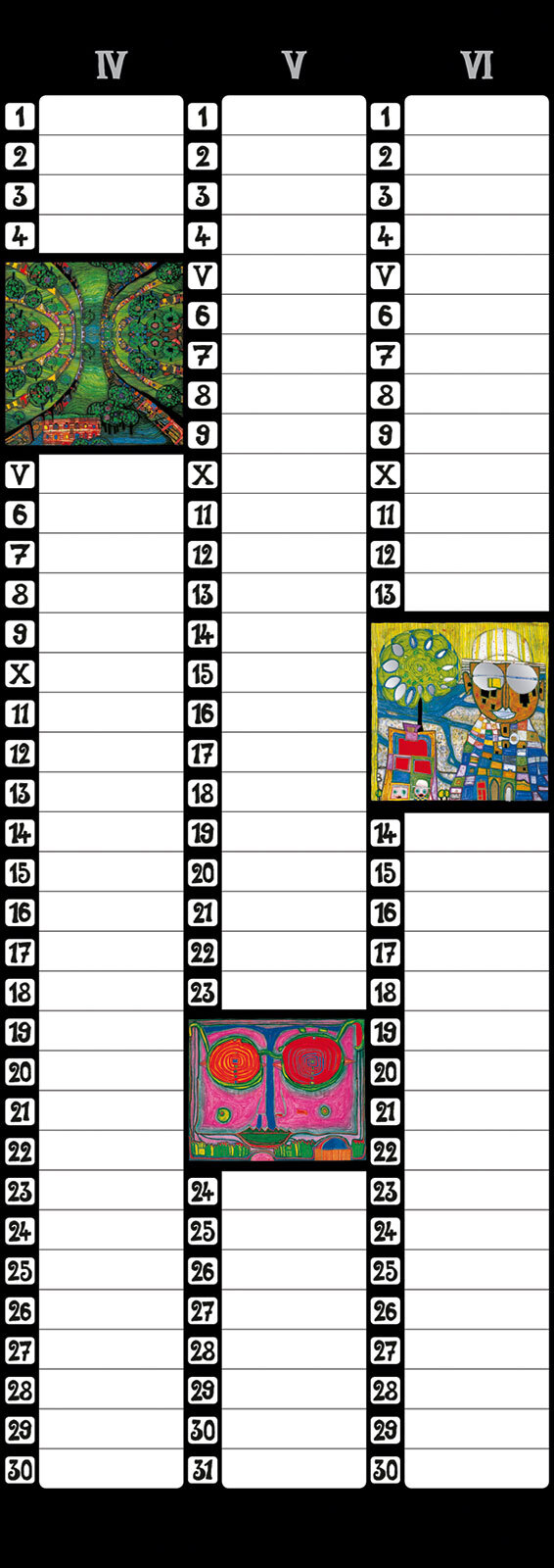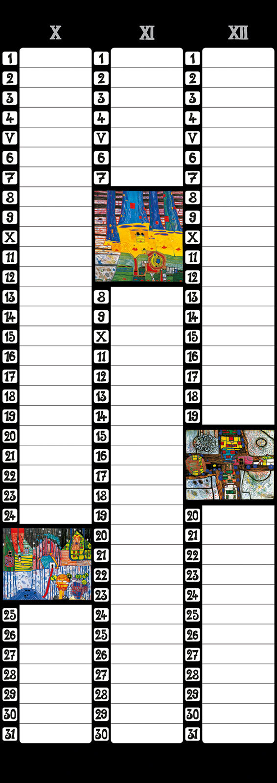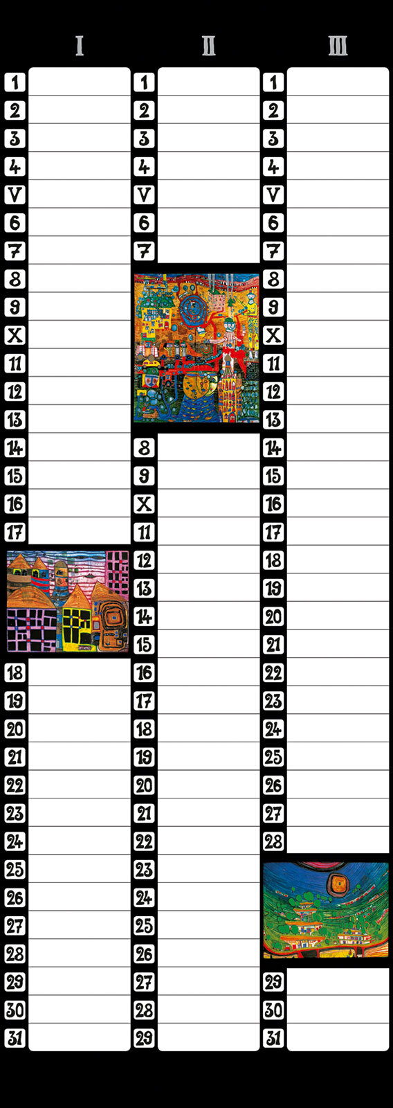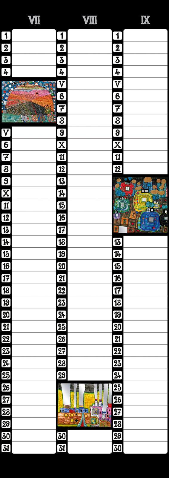 Format: 23 x 65 cm 5 Blatt, FSC-Papier Titel- und Innenblätter mit Glanzfolienprägung 3-Monats-Kalendarium Der Hundertwasser Birthday Calendar im Format 23 x 65 cm besticht durch das 3-Monats-Kalendarium, das reichlich Platz bietet, um Geburtstage einzutragen....