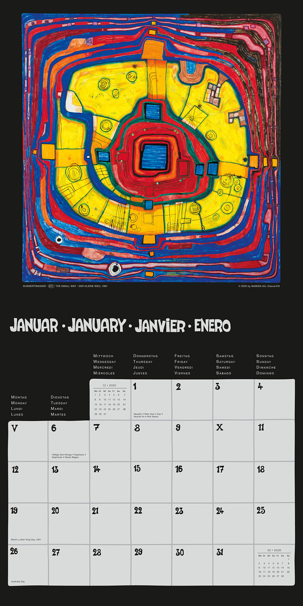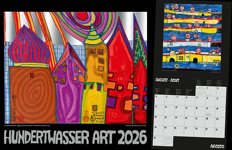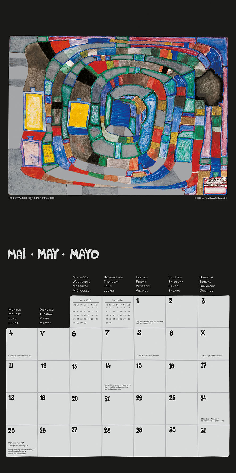 14 Blatt, Titelblatt mit Glanzfolienprägung Format: 30 x 30 cm, offen 30 x 60 cm Viersprachiges Kalendarium: DE, EN, FR, ES Klimaneutraler Druck auf FSC-Papier Made in Germany Der besondere Broschürenkalender. Der Hundertwasser Broschürenkalender Art 2026 im F...