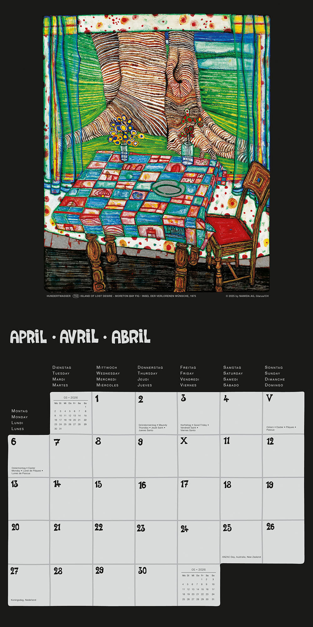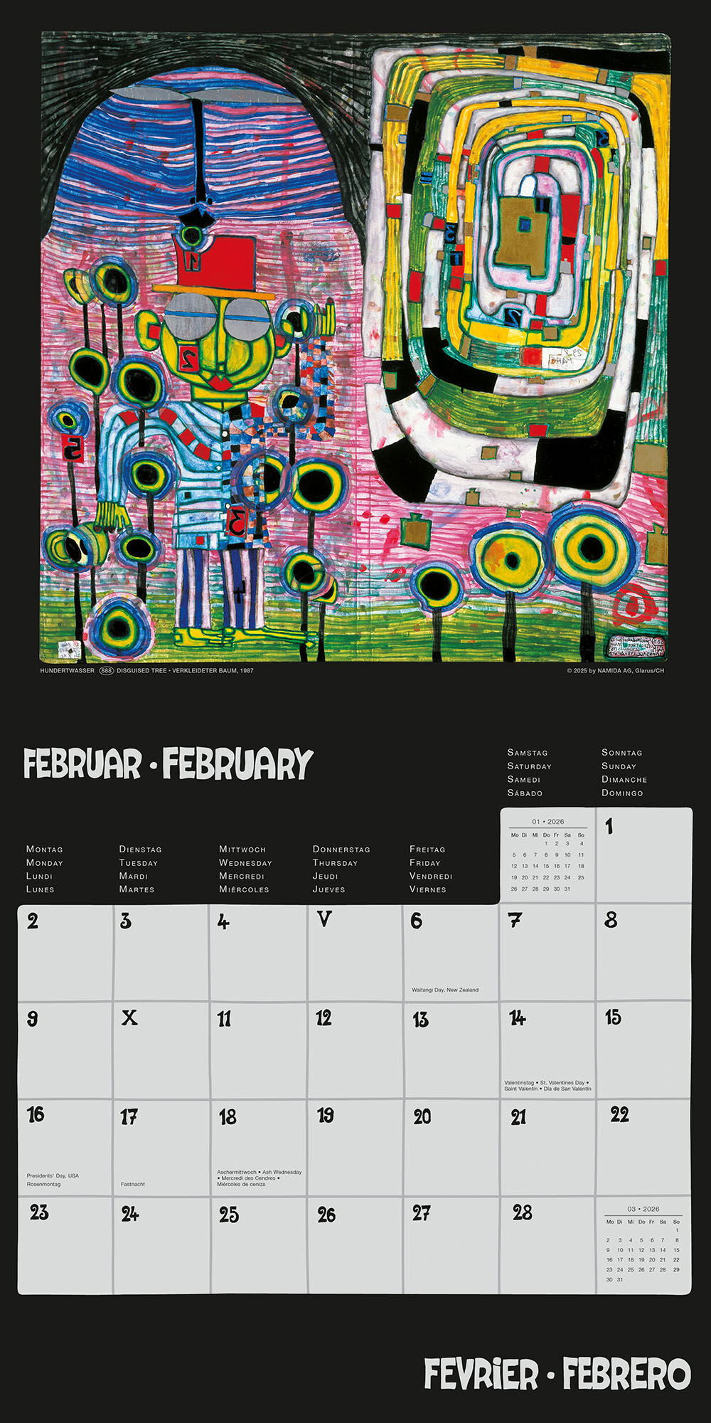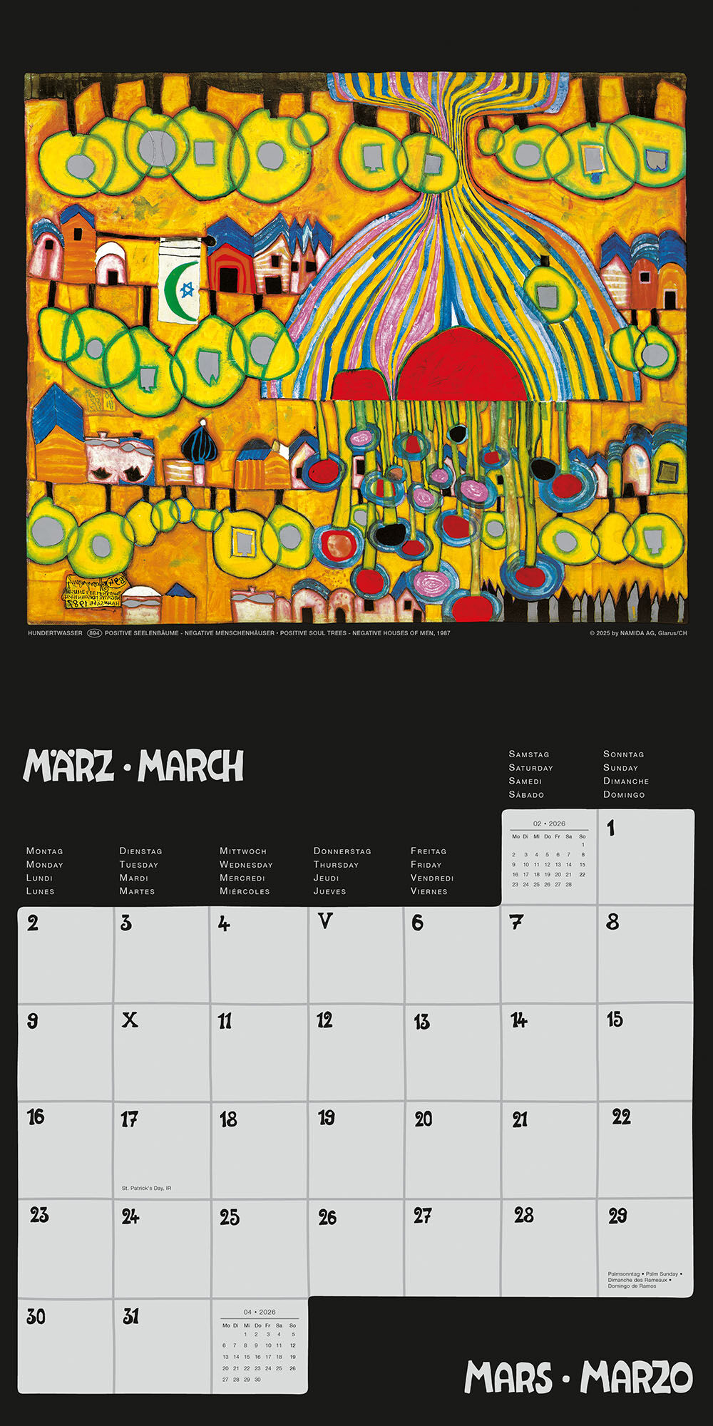 14 Blatt, Titelblatt mit Glanzfolienprägung Format: 30 x 30 cm, offen 30 x 60 cm Viersprachiges Kalendarium: DE, EN, FR, ES Klimaneutraler Druck auf FSC-Papier Made in Germany Der besondere Broschürenkalender. Der Hundertwasser Broschürenkalender Art 2026 im F...