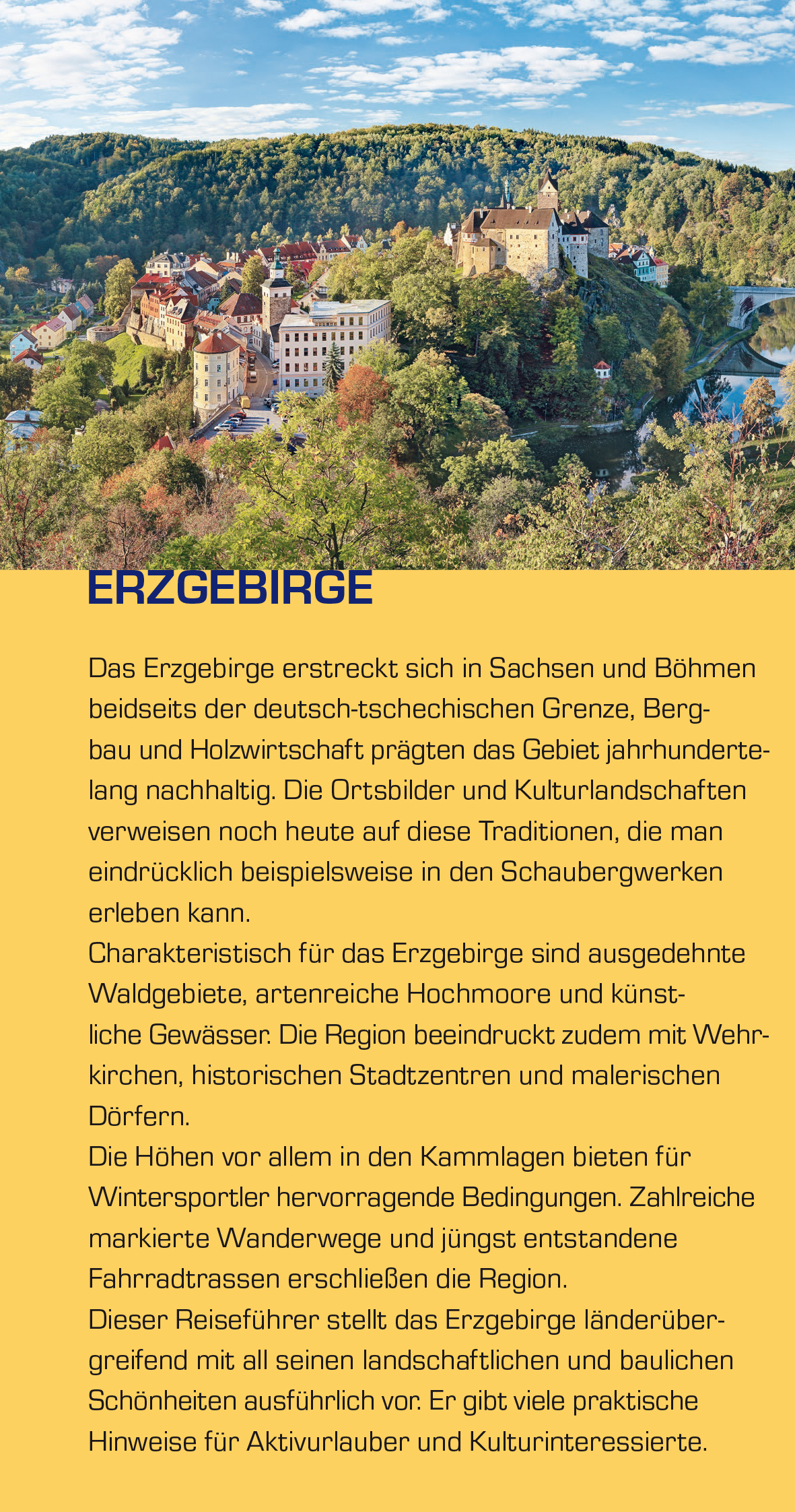 Dieser Reiseführer bietet sogar Einheimischen noch manche Anregung. Er stellt das Erzgebirge länderübergreifend mit allen seinen Schönheiten ausführlich vor. Zahlreiche praktische Reisetipps helfen bei der Vorbereitung einer Reise ins Erzgebirge. Für Aktivurla...Dieser Reiseführer bietet sogar Einheimischen noch manche Anregung. Er stellt das Erzgebirge länderübergreifend mit allen seinen Schönheiten ausführlich vor. Zahlreiche praktische Reisetipps helfen bei der Vorbereitung einer Reise ins Erzgebirge. Für Aktivurlauber gibt es Vorschläge für Wanderungen und Radtouren sowie Hinweise für Skifahrer und Wassersportler. Das landschaftlich überaus reizvolle Erzgebirge erstreckt sich in Sachsen und Böhmen beidseits der deutsch-tschechischen Grenze. Es ist eine einmalige Kulturlandschaft, die für interessierte Besucher viele Schätze bereithält. Unvergessliche Erlebnisse kann man auf einer Reise durch das wunderschöne Mittelgebirge finden, das statt mit spektakulären Gipfeln eher durch die Vielfalt seiner Landschaft bezaubert. Bergbau und Holzwirtschaft prägten das Gebiet jahrhundertelang nachhaltig. Die Ortsbilder und Kulturlandschaften verweisen noch heute auf diese Traditionen, die man eindrücklich in den vielen Schaubergwerken und Museen erleben kann. Städte wie Olbernhau, Freiberg, Annaberg-Buchholz, Oberwiesenthal oder Chemnitz werden ebenso vorgestellt wie das Egertal, Cheb, Usti nad Labem oder Teplice. >>> Weitere Reiseführer zu Ostdeutschland und Osteuropa finden Sie auf der Website des Trescher Verlags