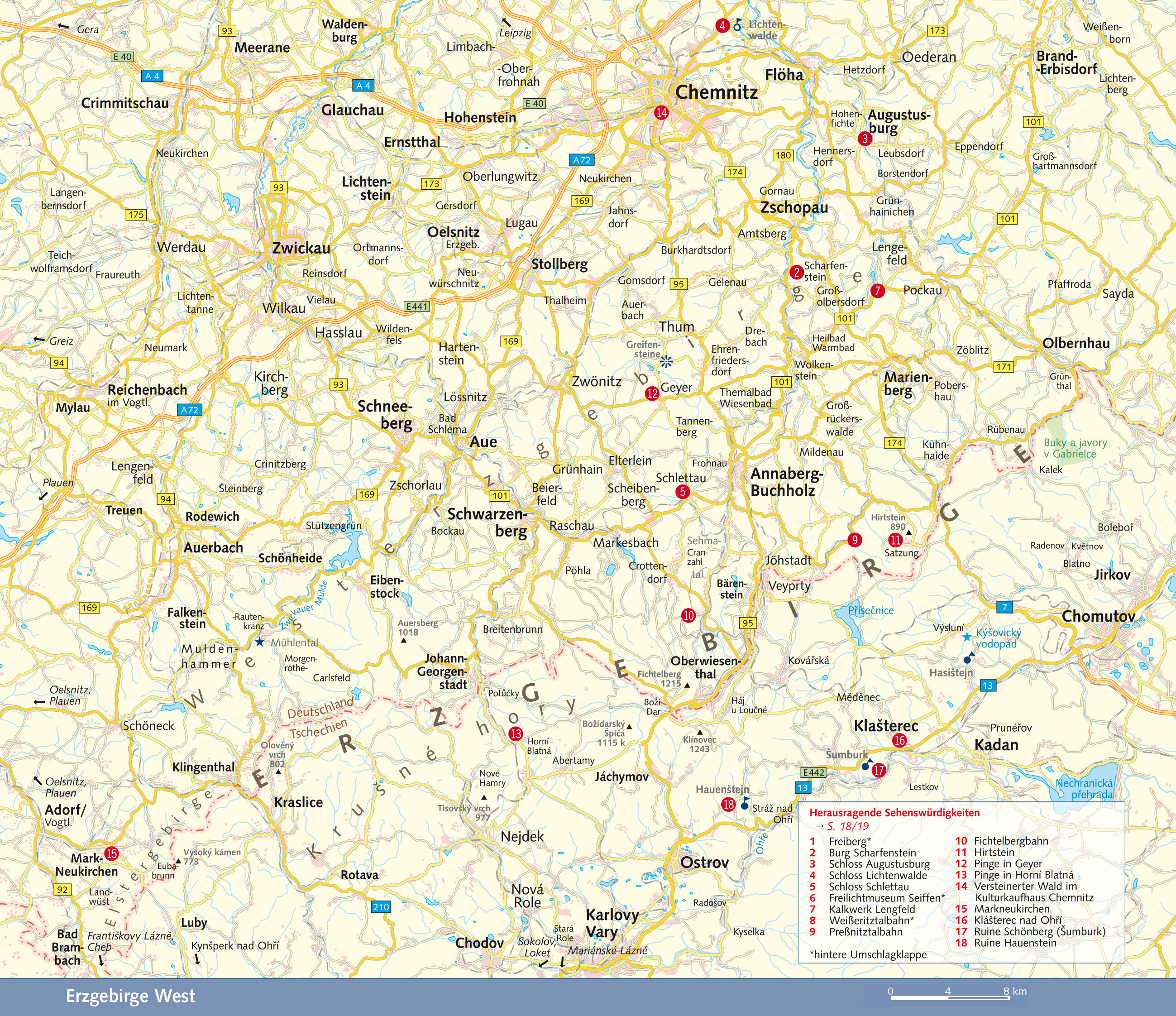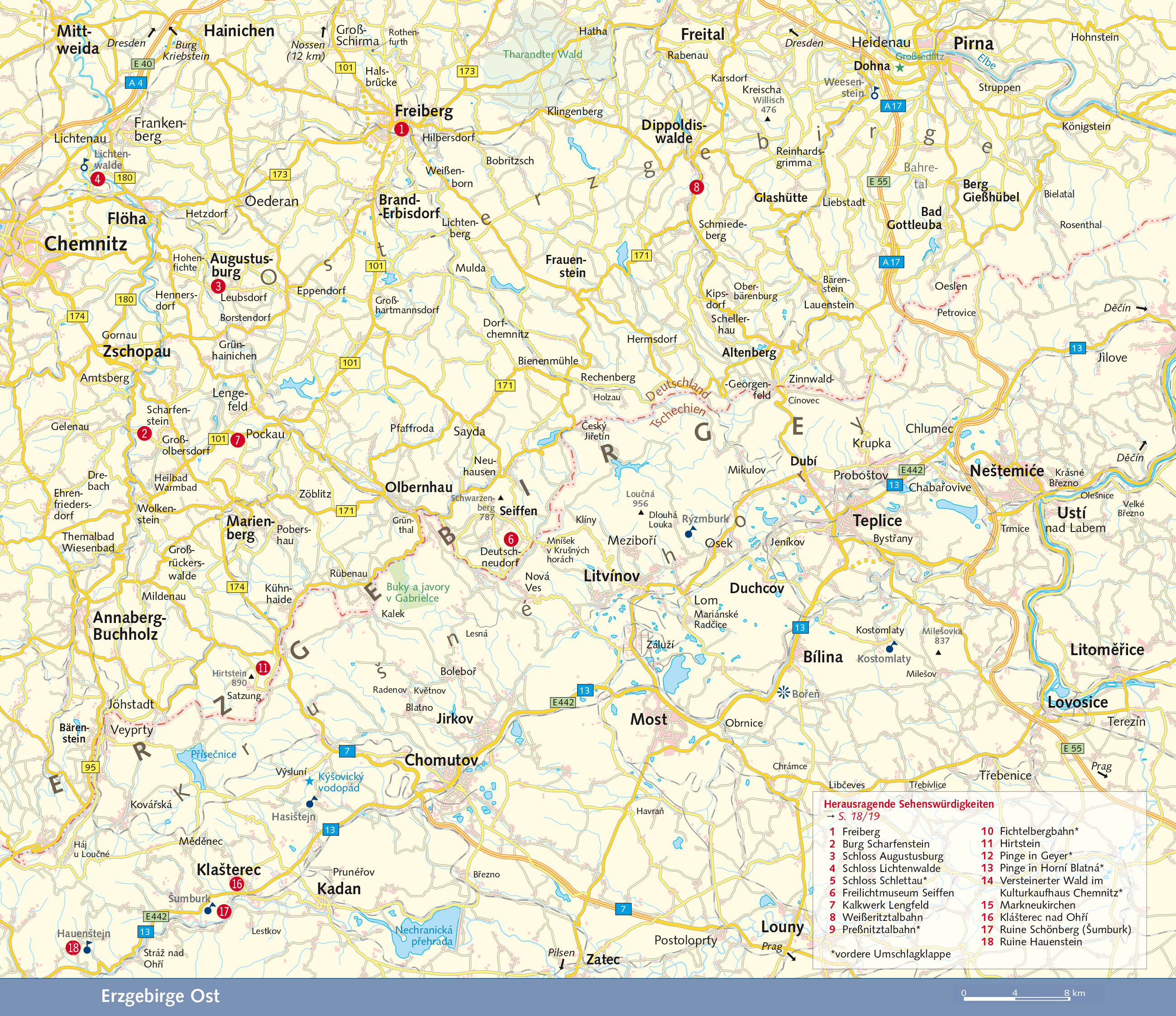 - Zieht aah dorch onnern Arzgebirg der Grenzgrobn wie ene Kett,der Grenzgrobn taalt de Länder ei, aber onnere Herzen net! (Anton Günther, 1876-1937) - - - Der Landstrich ist so reich, dass er noch vielen Generationen von Erzgebirgern und Gästen erfüllte Leben beziehungsweise stressfreie Urlaube schenken kann. Demut vor und Kontakt mit der Natur waren seit jeher ein Kraftquell der tapferen Bergbewohner, viele Verse des verehrten Anton Günther erzählen beispielsweise von Vogelgesang und Wildfrüchten. Leider finden immer noch Aktivitäten Beifall, die begrenzte Ressourcen verschwenden. In der Auflage 2019 stand, dass die allgemein zunehmenden Dürreperioden dem Erzgebirge bisher kaum etwas anhaben konnten. Im Sommer 2020 erlebte man dann, dass einige kleine Bäche nahezu versiegten.Die heutige Grenze zwischen Sachsen und Böhmen besteht seit 1459 und ist somit eine der stabilsten der Welt. Trotz mancher Nationalitätenkonflikte mit besonders beschämenden Ausprägungen im vorigen Jahrhundert fand und findet im Erzgebirge immer auch Völkerverständigung statt. Entsprechende Initiativen möchte das vorliegende Buch unterstützen. Seit 2007 ist die Staatsgrenze im Erzgebirge kaum noch in der Landschaft spürbar. Man darf sie sogar legal querfeldein queren. Voraussetzung ist lediglich ein gültiger Personalausweis oder Reisepass. Autolenker können ohne Halt passieren und brauchen zunächst nur an die Lichtpflicht in Tschechien zu denken.Vorsicht, dieses Buch ist subjektiv und interkulturell: Erstens ist dieses Buch subjektiv, weil die Herzen der Autoren für nachhaltigen Tourismus und regionale Wirtschaftsstrukturen schlagen, Schneekanonen und Imbisskonzerne haben da einen schweren Stand. Trotzdem sind alle größeren Skihänge erwähnt.... Zweitens ist dieses Buch subjektiv, weil die Autoren Menschen mit begrenzten Kapazitäten sind und ihr Erzgebirge sich täglich ändert. Dennoch sind sie stolz darauf, recht umfangreiche Erfahrungen beiderseits der Staatsgrenze hier präsentieren zu dürfen. In einigen Fällen verließen sie sich auf Angaben Dritter, weder haben sie die Höhen der Berge nachgemessen noch alle recherchierten Öffnungszeiten persönlich getestet. Konstruktive Hinweise der Leserschaft für Folgeauflagen werden gern entgegengenommen! Schließlich ist es subjektiv, weil es gar nicht anders geht. Oder hat schon jemand einen objektiven Reiseratgeber gesehen? Wer könnte und dürfte die Ausgewogenheitskriterien dafür definieren?Dieses Buch ersetzt keine GPS-Daten oder Landkarten. Detaillierte Wegbeschreibungen zu allen erwähnten Orten würden den Rahmen dieser Publikation sprengen. Enthaltene Wandervorschläge sind als bewährte Anregungen bei geeignetem Wetter gedacht. Die Autoren empfehlen insbesondere die App Mapy.cz beziehungsweise den entsprechenden Internetauftritt. Touristische Informationsbüros verteilen mitunter zudem kostenlose Landkarten.>>> Weitere Reiseführer zu Ostdeutschland und Osteuropa finden Sie auf der Website des Trescher Verlags