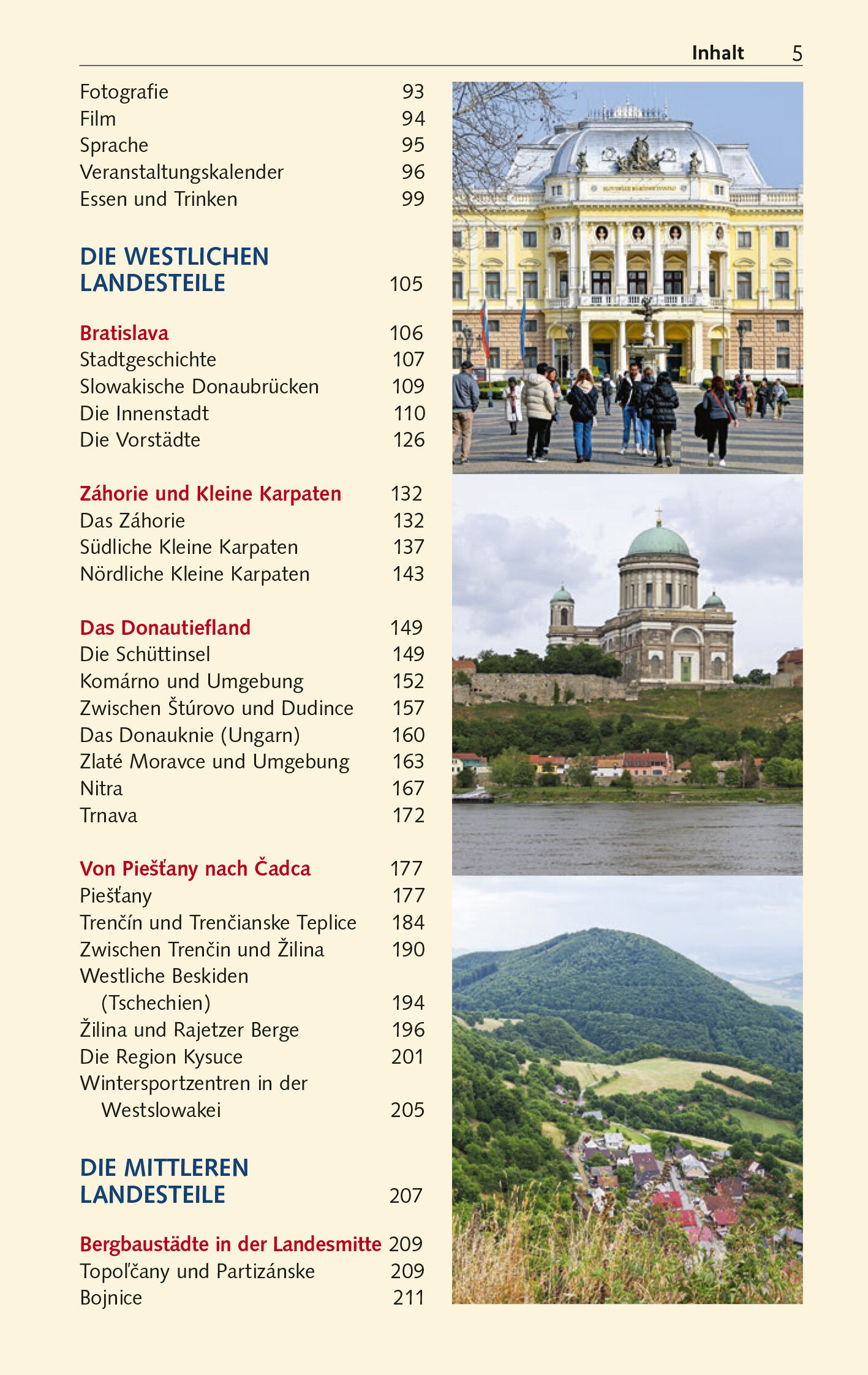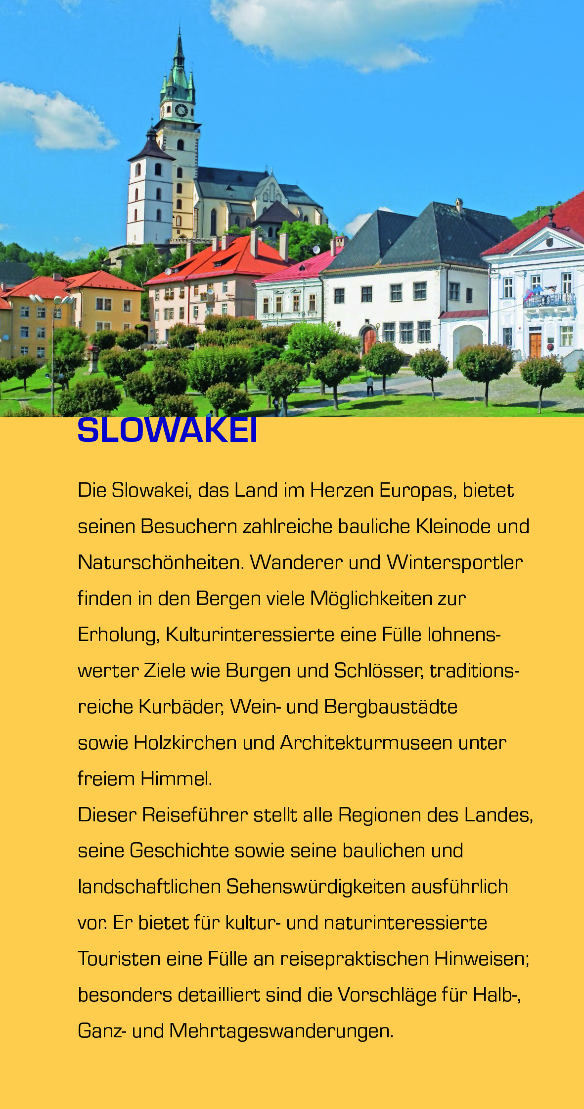 Die erste Auflage dieses Reiseführers erschien 2002 und zahlreichen Lesern bis hin zu niederländischen Campingplatzbetreibern in der Slowakei waren die vergangenen Auflagen ein Schlüssel zum Land. Vieles ist geblieben, vieles hat sich verändert. Die vorliegende Auflage wurde nicht nur punktuell ergänzt, sondern Wort für Wort überprüft und stellenweise umsortiert. Sie berücksichtigt aktuelle Entwicklungen und bietet viele Anregungen, beeindruckende Natur und interessante Kulturgeschichte auch mit kleinem Budget zu erkunden.Auch fast zwei Jahrzehnte nach der Schengen-Öffnung der Slowakei soll es noch immer vorkommen, dass dieses Land in Brüssel mit dem weniger als halb so großen Slowenien verwechselt wird. In der Slowakei gibt es die höchsten Berge der Karpaten, dennoch wird dieser sich durch mehrere Länder erstreckende Gebirgsbogen meistens mit Rumänien assoziiert. Die Sprache im geographischen Zentrum der slawischen Völker gilt als slawisches Esperanto, aber kaum ein Ausländer lernt Slowakisch.Touristen finden unverbrauchte Landschaften und herzliche Gastfreundschaft. Hauptattraktion für Naturfreunde sind mehrere Gebirge mit Gipfelhöhen um die 2000 Meter, welche mit weiten Rundblicken von vorbildlich beschilderten Wegen locken, aber meistens noch bis in die Kammlagen grün sind. Weiterhin machen lebendige Städte und verträumte Städtchen mit oft sorgfältig renovierten Ortsbildern, Weinberge und Höhlen, Burgen und Schlösser, Freilichtmuseen und Holzkirchen, eine bunte Folklore mit Festivals vor allem zur Sommerzeit, eine rustikale Küche mit steigendem Niveau öffentlicher Restaurants, ein gutes Verkehrsnetz sowie vielfältige Sportmöglichkeiten die Slowakei zu einem sehr attraktiven Urlaubsziel. Ob überdimensionierte Umgehungsstraßen und internationale Handelskonzerne eher einen Komfortgewinn oder einen Romantikverlust darstellen, mag jeder selbst beurteilen. Wer gemächliches Tempo bevorzugt, kommt jedenfalls auch ohne Benutzung der kostenpflichtigen Autobahnen oft kaum später an.Die Slowakei ist ein sehr sicheres Urlaubsland, verglichen mit den beliebten Reiseländern am Mittelmeer liegt es zudem fast um die Ecke. Einzig echte Meeresküsten fehlen, dafür gibt es jede Menge natürliches Thermalwasser. Lange bekannt sind Thermalbäder und Kuranlagen mit Piestany an der Spitze, ergänzt werden sie durch moderne Spaßbäder.Im globalen Nachhaltigkeits-Ranking "Euromonitor Sustainable Travel Index" von 2021 erreichte die Slowakei Platz 2 zwischen Schweden und Finnland, Slowenien Platz 9 und Deutschland Platz 15. Die vorderen 20 Plätze sind übrigens alle von europäischen Staaten belegt, Kanada folgt auf 21. Man darf gespannt sein, ob die Slowakei diese hervorragende Platzierung verteidigen kann und wie sich Trencín im Kulturhauptstadt-Jahr präsentieren wird.