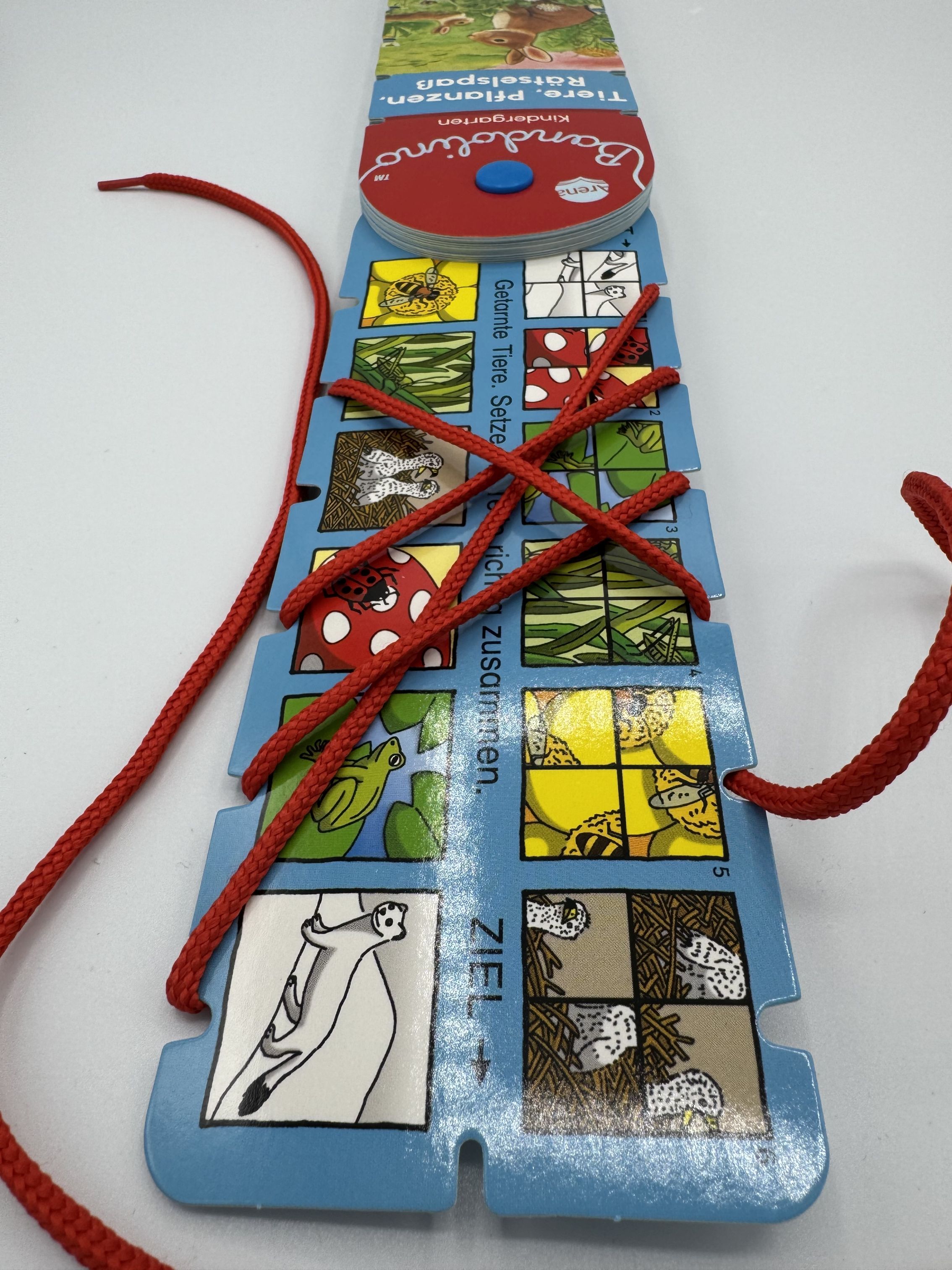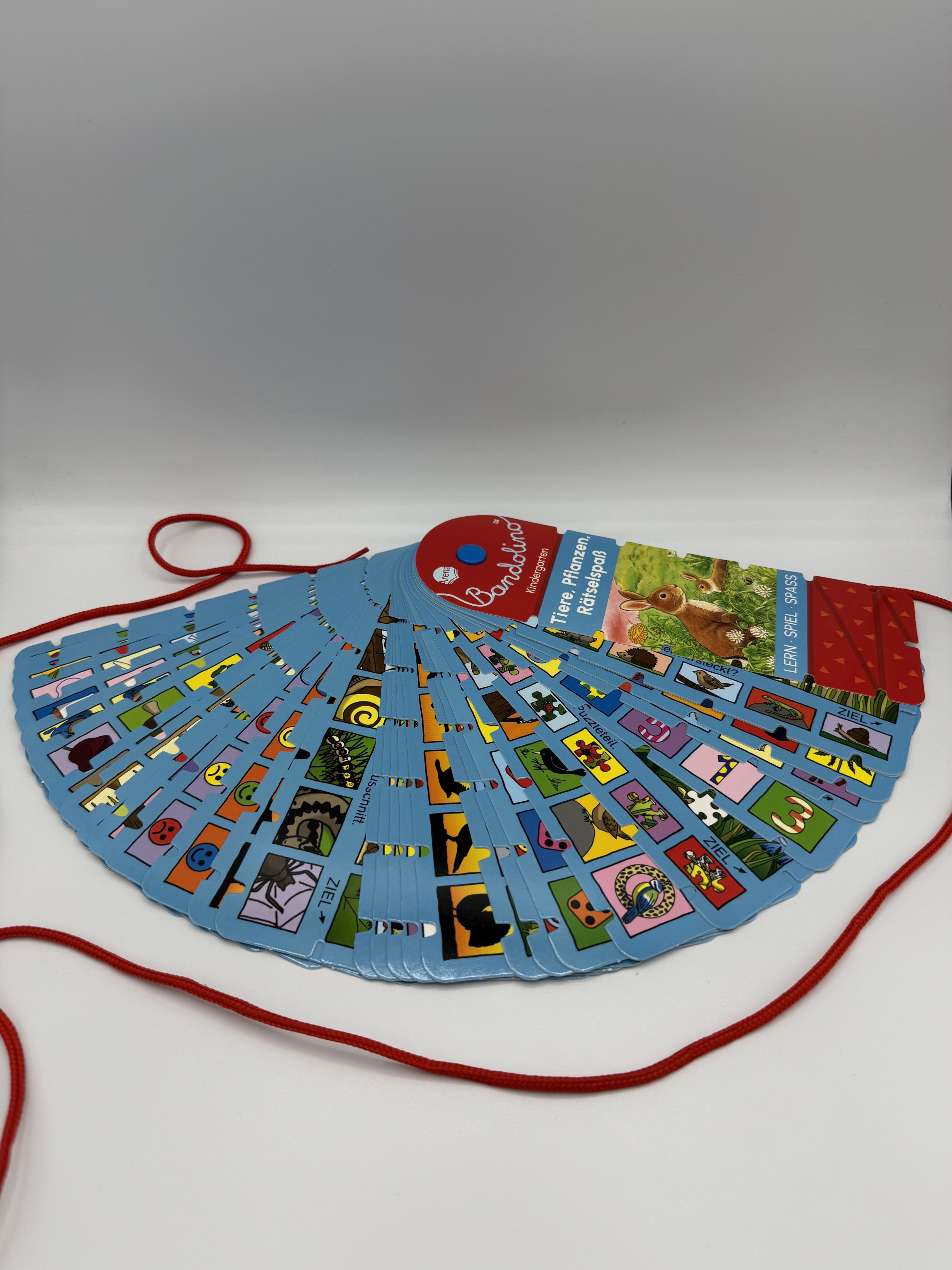 Ein Rätsel spaziergang durch die Natur erwartet Kindergartenkinder in diesem Bandolino- Lernspielfächer mit der Lösungsschnur . Sie dürfen den Bäumen im Wald den richtigen Ausschnitt zuordnen. Sie dürfen die Tiere auf der Wiese suchen und die Vögel im Garten ...