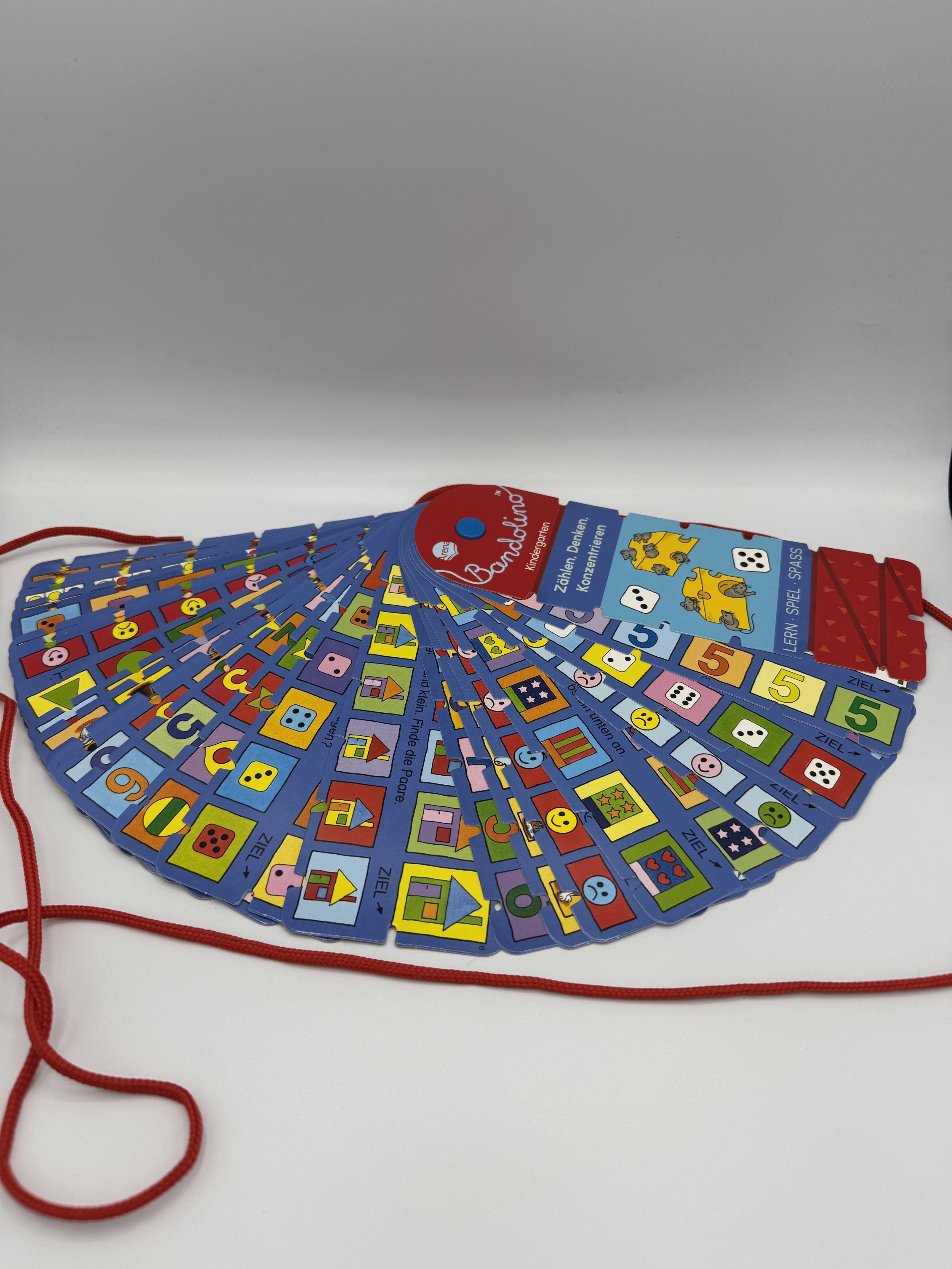 Motiviert lernen mit Lösungskontrolle ! In dem stabilen Lernspielfächer Bandolino erwarten Kindergarten- und Vorschulkinder viele abwechslungsreiche Aufgaben . Einfach die richtigen Bildpaare mit der Schnur verbinden und auf der Kartenrückseite die Lösung kon...