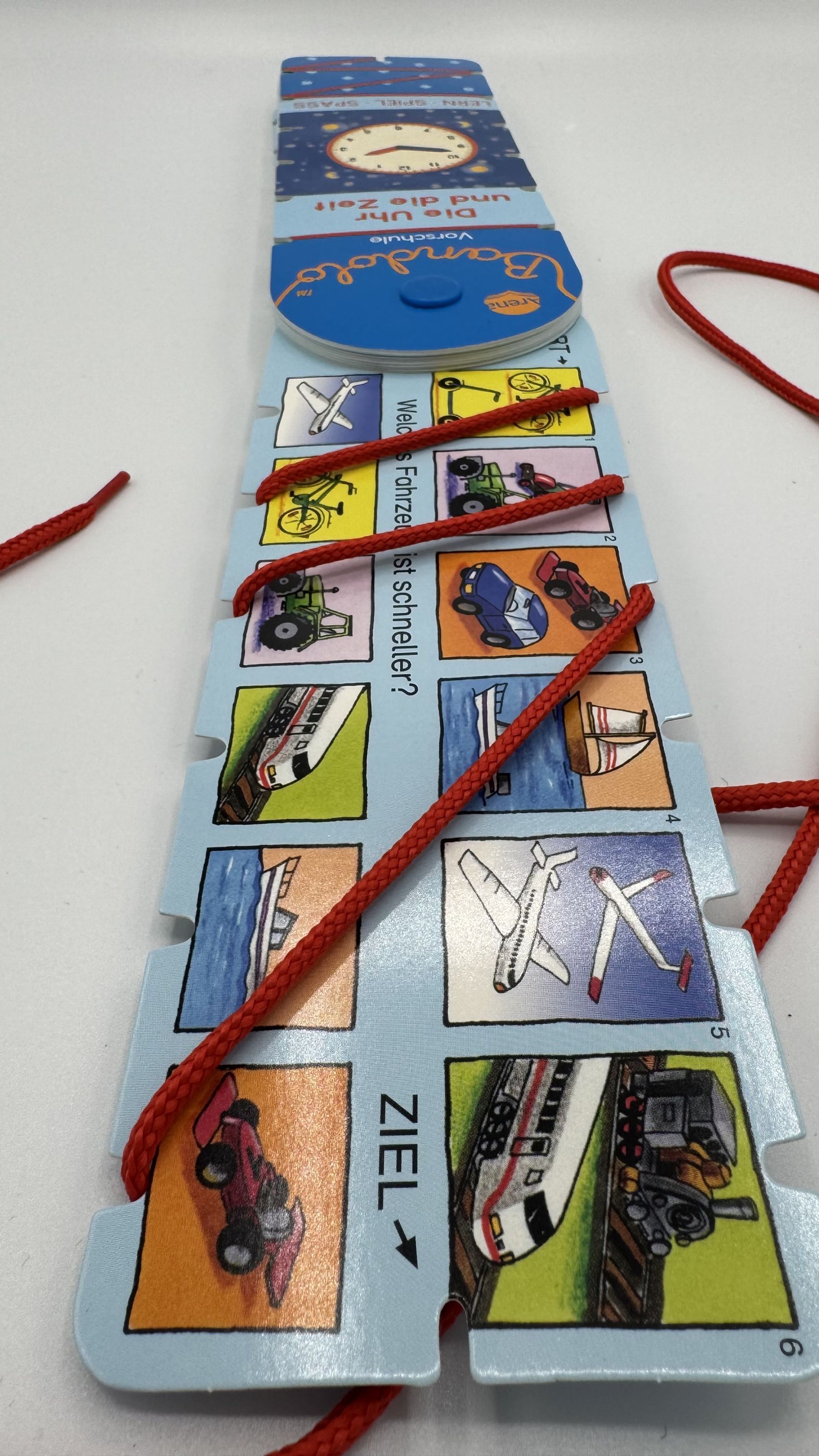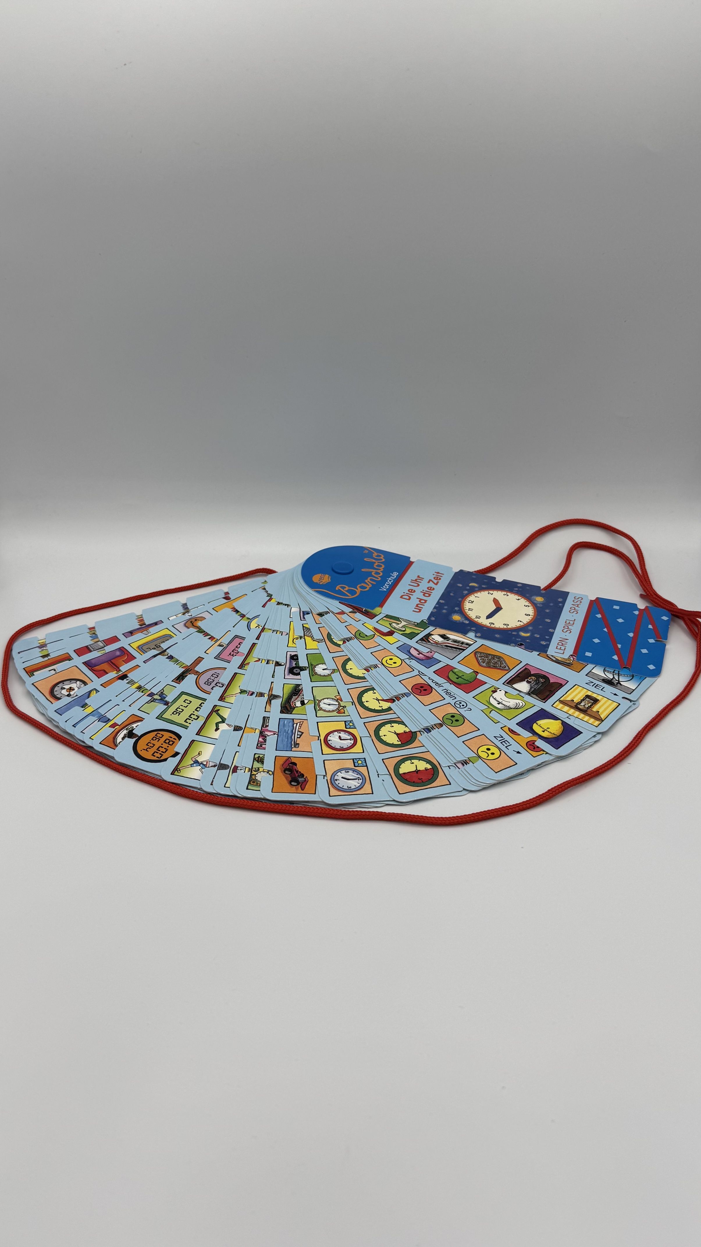 Bandolo - Die Uhr und die Zeit Motiviert lernen mit Lösungskontrolle ! In dem stabilen Lernspielfächer Bandolo erwarten Kinder zum Schulanfang viele abwechslungsreiche Aufgaben . Einfach die richtigen Bildpaare mit der Schnur verbinden und auf der Kartenrückse...