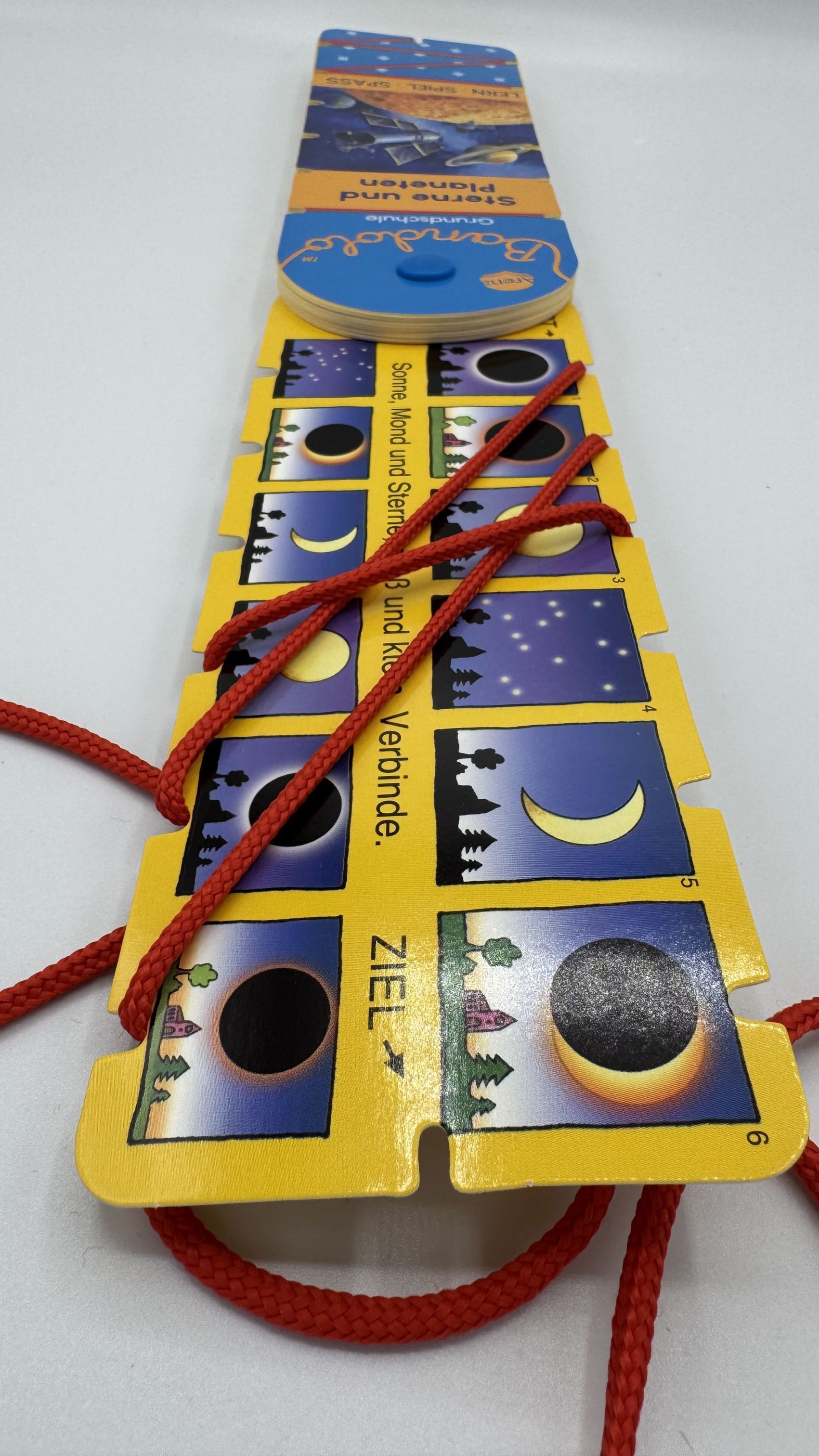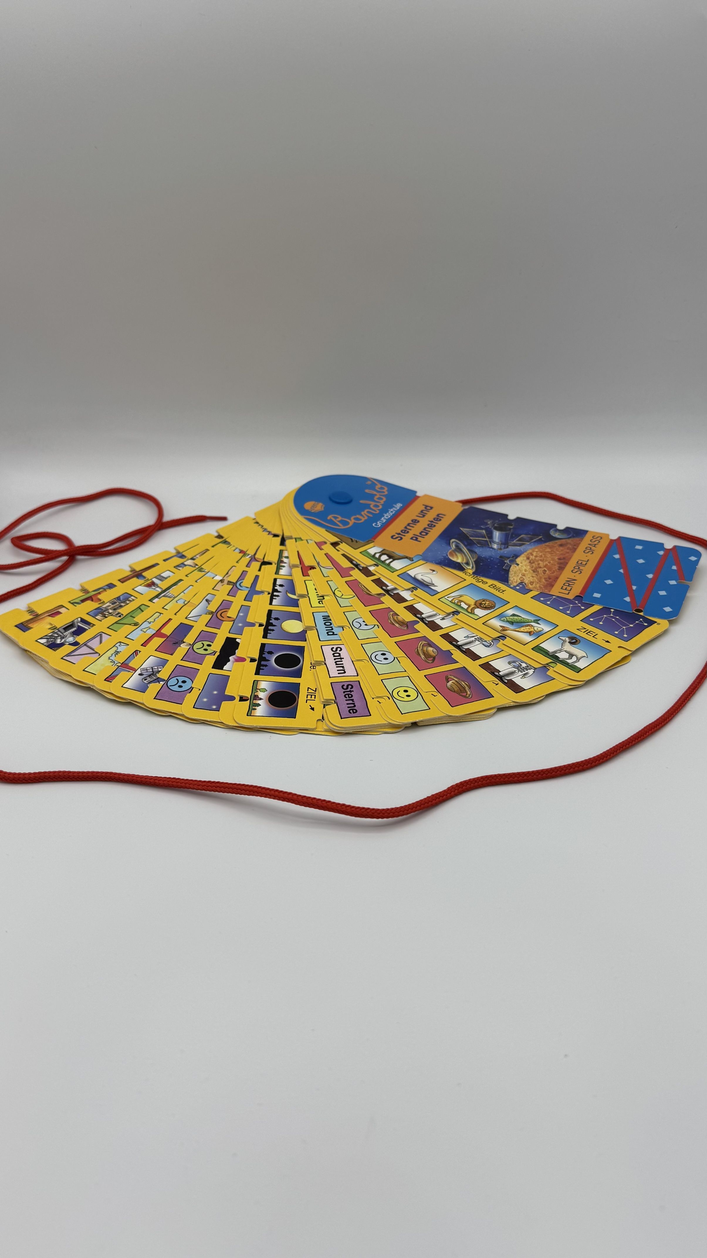 Motiviert lernen mit Lösungskontrolle ! In dem stabilen Lernspielfächer Bandolo erwarten Kinder zum Schulanfang viele abwechslungsreiche Aufgaben . Einfach die richtigen Bildpaare mit der Schnur verbinden und auf der Kartenrückseite die Lösung kontrollieren ....