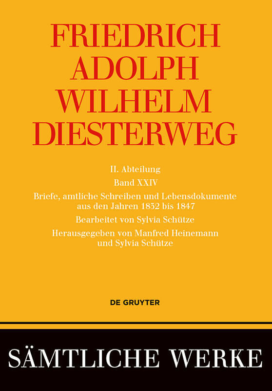 Band 24 enthält sämtliche bekannten Briefe und amtlichen Dokumente aus dem Zeitraum seiner Dienstzeit als Direktor des Seminars für Stadtschullehrer in Berlin bis hin zu seiner Amtsniederlegung (18321847). Die amtlichen Schreiben dokumentieren Diesterwegs Ring...