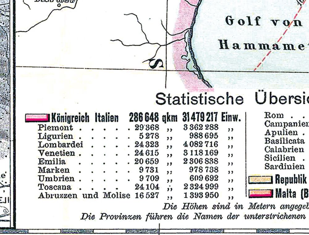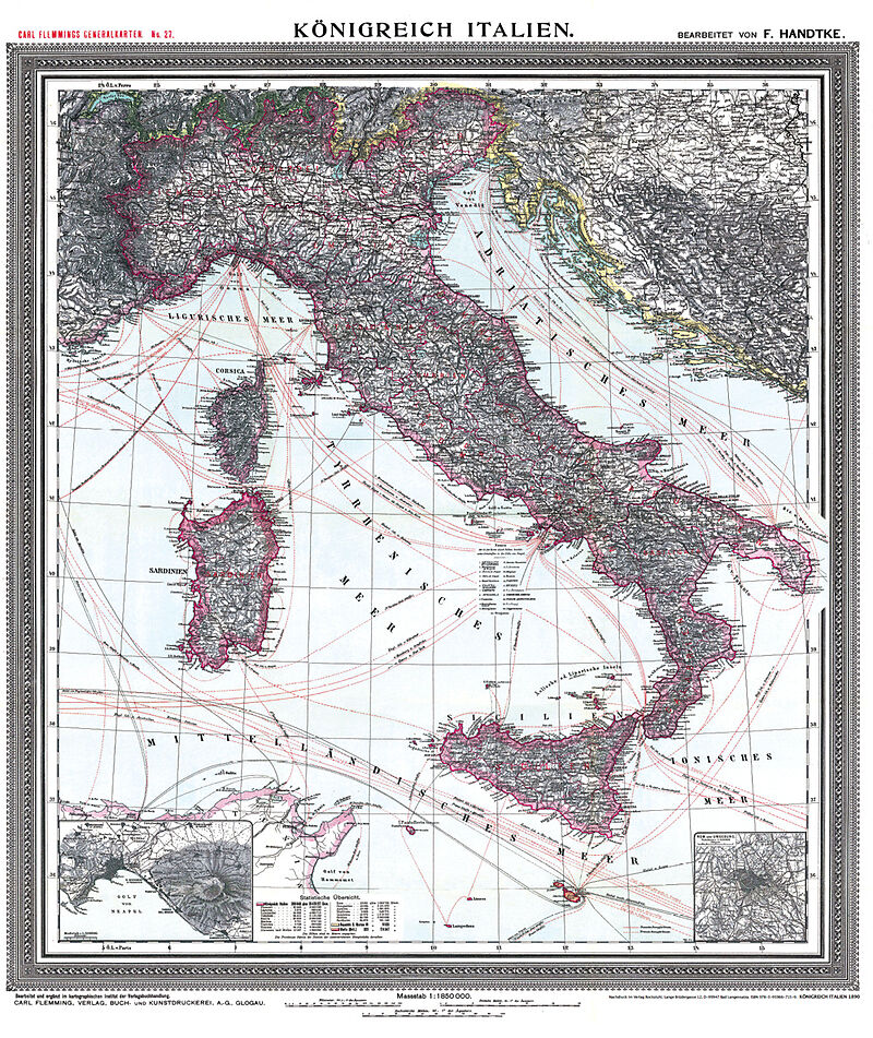 Historische Karte: KÖNIGREICH ITALIEN 1890, Der Nachdruck hat ein Außenformat von (Breite x Höhe) 70 x 83 cm. [Lieferung in einer sehr stabilen Pappversandhülse - bis 72 cm lang - 250 g] ZUR KARTE Großformatige Karte von Italien 1890, herausgegeben von Carl Fl...