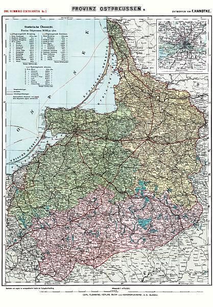 Nachdruck. Preußische Provinz im Deutschen Reich. Außenformat (Breite x Höhe) 65 cm x 95 cm - Darstellungsgröße (Breite x Höhe) 63,7 x 87,7 cm. Grenz-und flächenkolorierte Karte mit den Regierungsbezirk Königsberg; Regierungsbezirk Gumbinnen und Regierungsbezi...