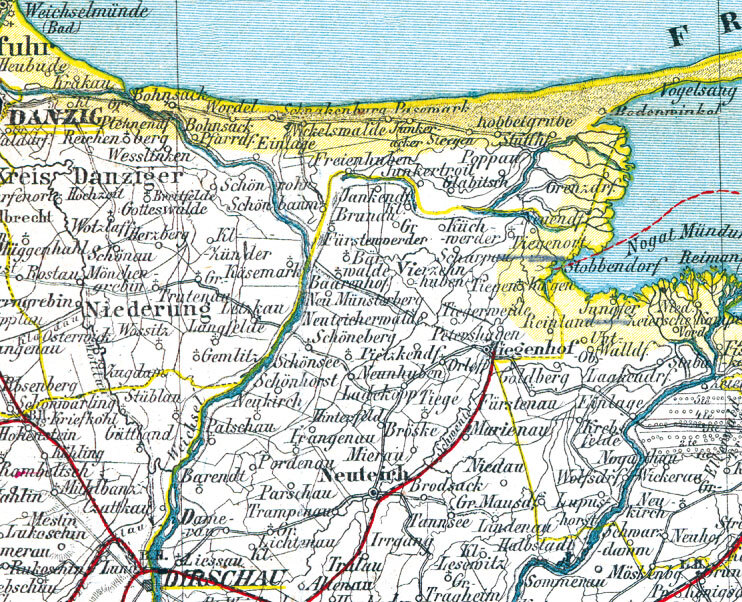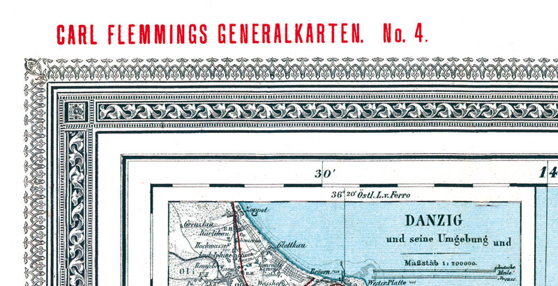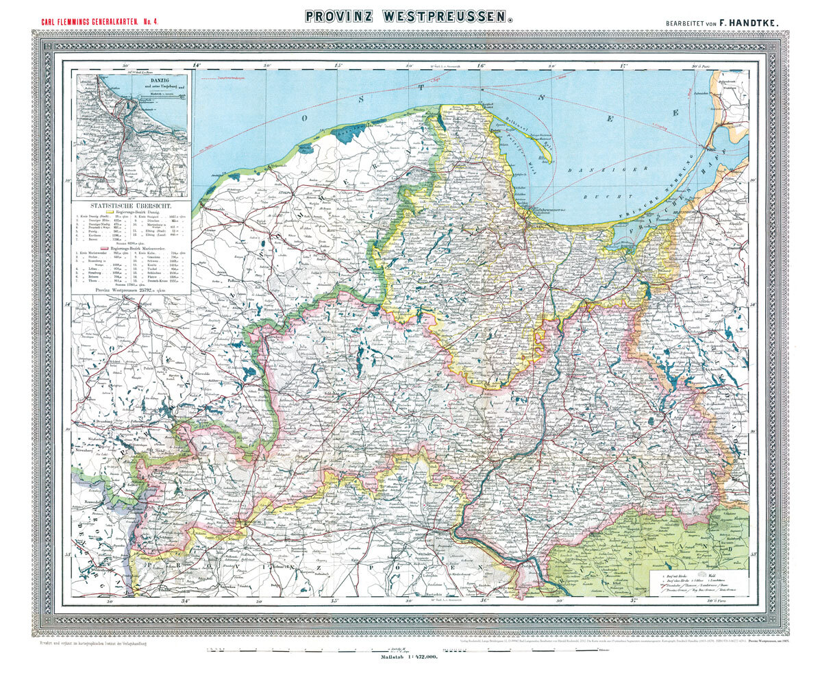 Nachdruck. Preußische Provinz im Deutschen Reich. Außenformat (Breite x Höhe) 78 x 64cm - Darstellungsgröße (Breite x Höhe) 72,2 x 62cm. Grenz-und flächenkolorierte Karte mit den Regierungsbezirken Danzig und Marienweder. Kartograph: Friedrich Handtke (1815187...