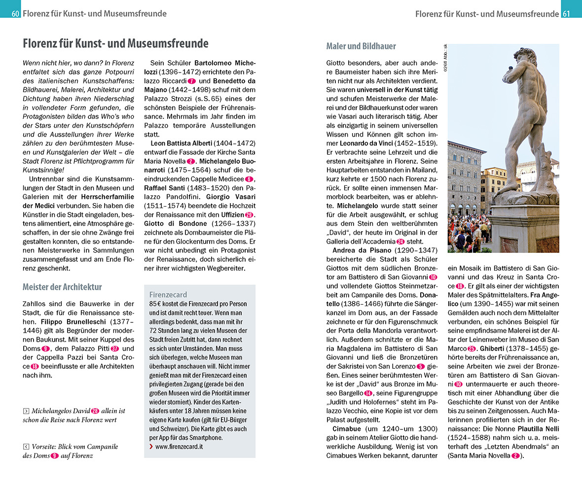 Florenz gilt als Wiege der Renaissance. Im Gewirr der Altstadt zeugen prächtige Kirchen und Paläste von dieser grandiosen Epoche. Weltberühmte Künstler wie Michelangelo und Leonardo da Vinci haben hier gewirkt. Die Galleria dell'Accademia und die Galleria deg...