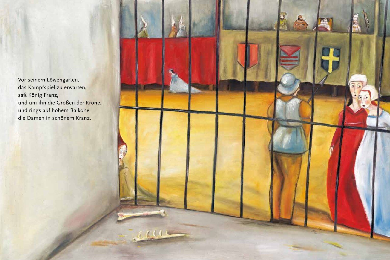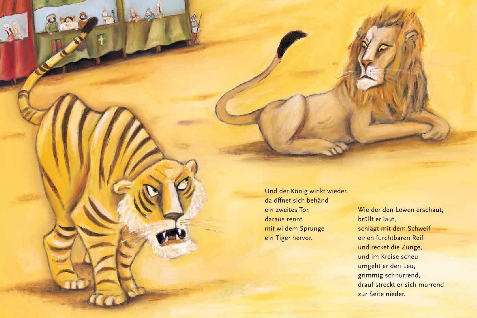 Schillers Ballade bietet ein unvergessliches Stuck deutscher Dichtung im Kinderbuch »Den Dank, Dame, begehr ich nicht « »Vor seinem Löwengarten, das Kampfspiel zu erwarten, saß König Franz « Und bald schon balgen sich brüllende Leoparden, Löwen und Tiger vor d...