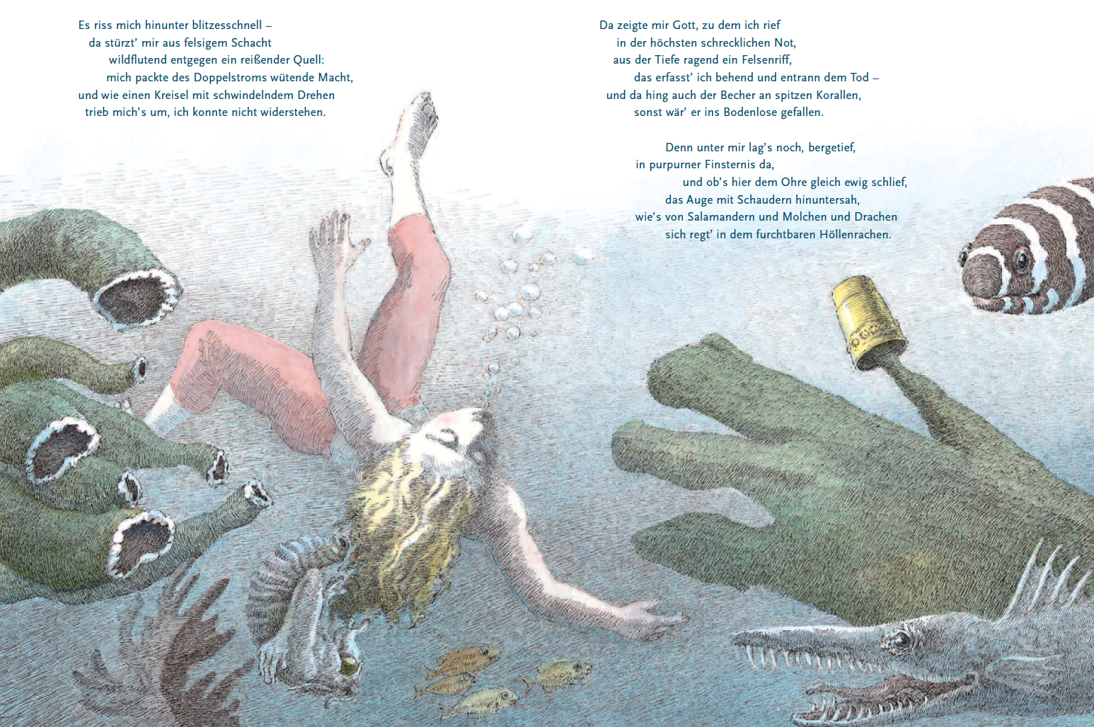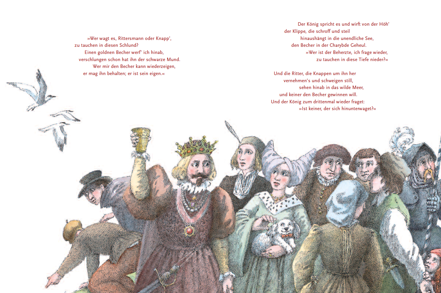 Wer wagt es, Rittersmann oder Knapp.? Dieser Ausruf des Königs bildet den Auftakt zu Friedrich Schillers berühmter Ballade Der Taucher. Wem es gelingt, einen goldenen Becher aus dem wütenden Meer zu bergen, der darf diesen behalten. Zum Entsetzen der Menge wag...