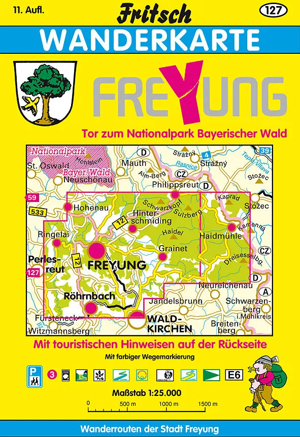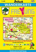 Wanderkarte mit Markierungszeichen wie in der Natur vorhanden. Mit Zentrumsplan der Stadt Freyung. Touristische Hinweise und Beschreibung von Wanderwegen auf der Kartenrückseite.