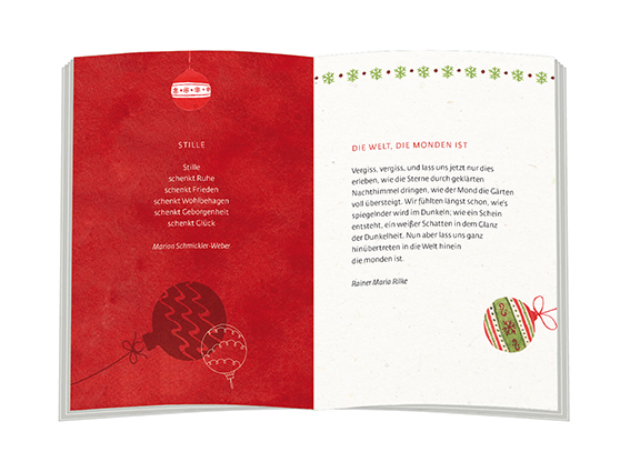 Fröhliche Weihnachten wünschen diese schönen Texte und schenken kleine Freuden für eine stimmungsvolle Weihnachtszeit. Mit Texten von Joachim Ringelnatz, Jörn Heller, Rainer Maria Rilke, Tina Willms, Marion Schmickler-Weber, u.a.