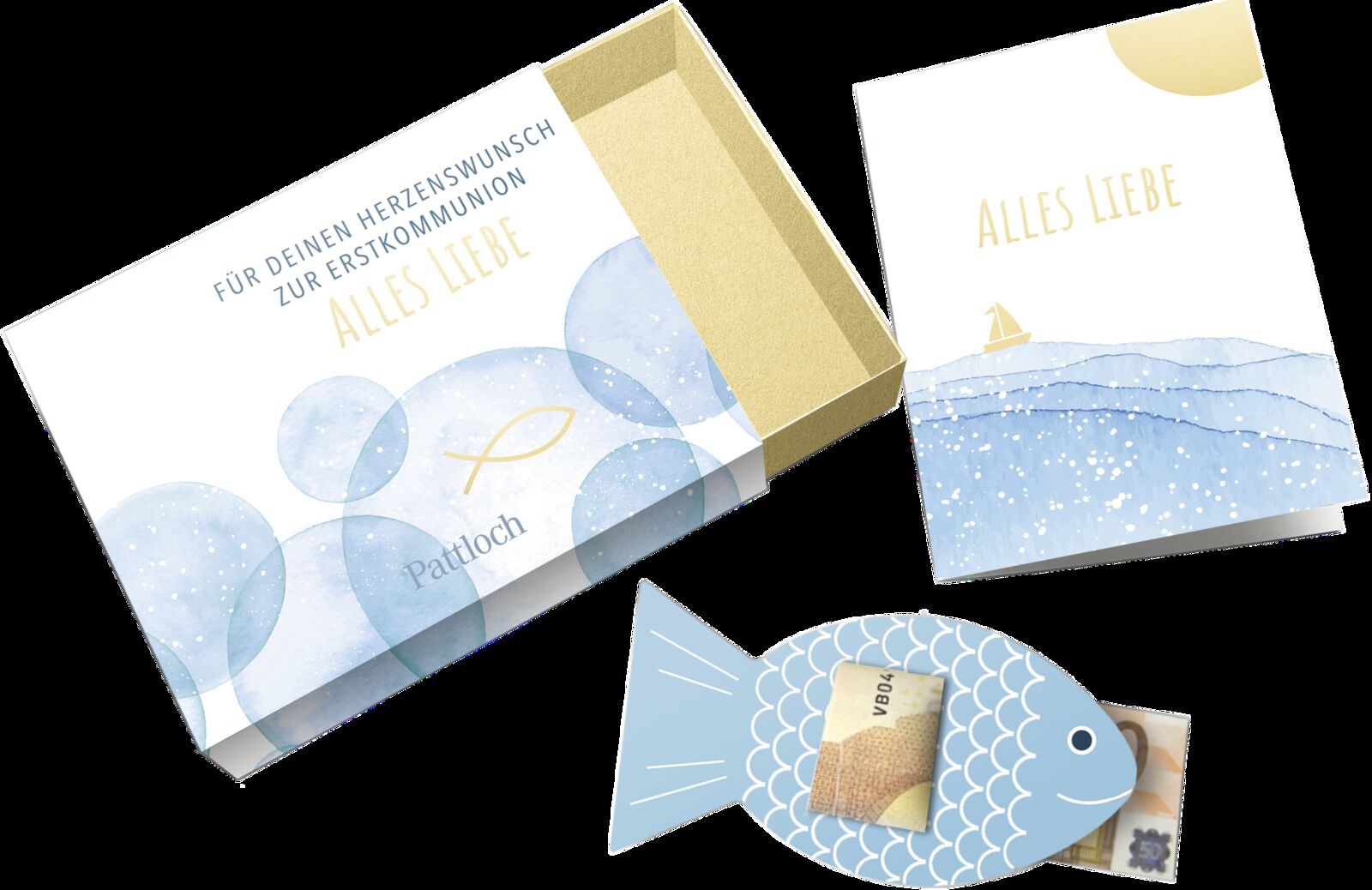 Originelle Geldgeschenk-Verpackung zur Kommunion Diese besondere Verpackung für ein Geldgeschenk oder einen Gutschein zur Erstkommunion enthält neben einer Klappkarte auch einen niedlichen kleinen Fisch, der als Klammer für Geldschein oder Gutschein dient. Ge...