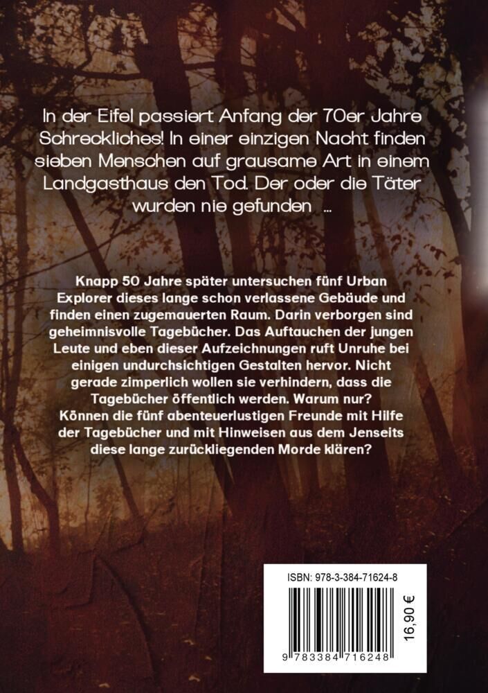 Die Eifel. Vor 50 Jahren fanden hier in einem beliebten Landgasthaus sieben schreckliche Morde statt. Nun kommen fünf Urban Explorer an diesen Lost Place und entdecken einen geheimen Raum. Gut versteckt finden sie darin Tagebücher. Mit Auffinden eben dieser Ta...