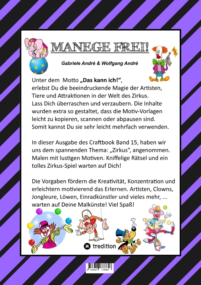 Das Craftbook Band 15, " Zirkusmanege, ist für alle Kinder ab dem Vorschulalter und Volkschülern besonders geeignet, welche Spaß daran haben, Rätsel zu lösen, zu basteln, zu malen und Motivationsübungen rund um das Geschehen in der Welt der Artisten, Tiere und...