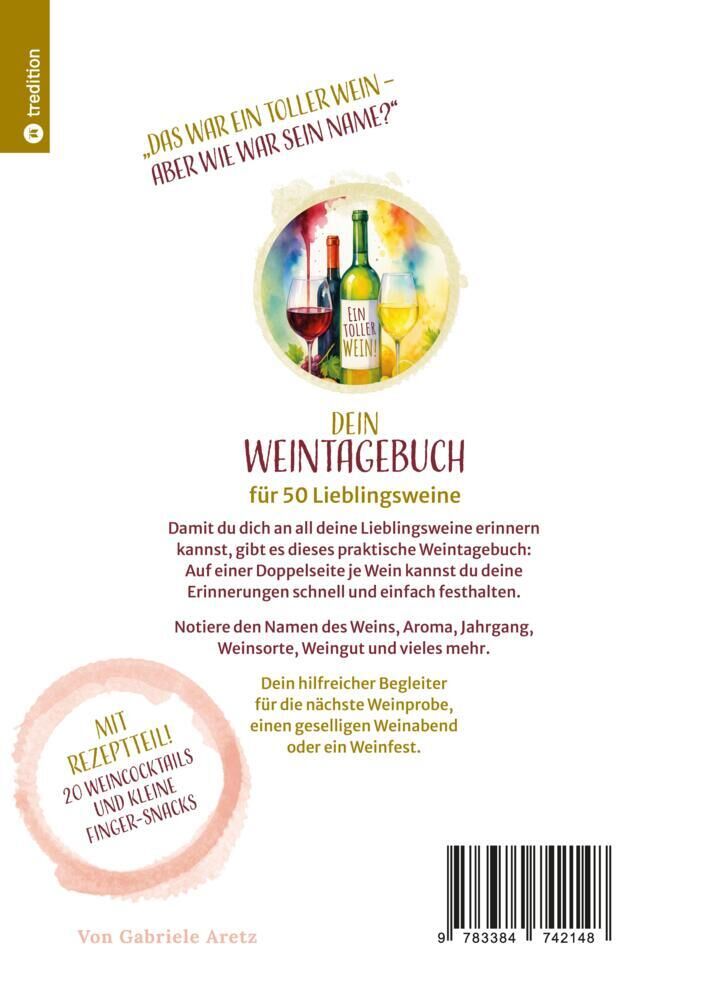 Ein toller Wein aber wie war nochmal sein Name? Dieses liebevoll gestaltete Weintagebuch hilft dir, deine 50 Lieblingsweine stilvoll und unterhaltsam festzuhalten. Ob bei einer Weinprobe, einem geselligen Abend mit Freunden oder beim gemütlichen Glas zu zweit:...