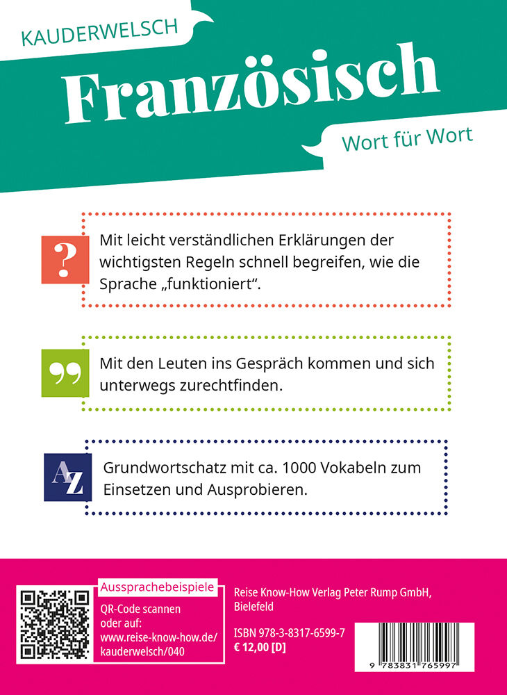 Dieser Kauderwelsch-Sprachführer Französisch unterstützt beim unkomplizierten Erlernen der Sprache, so dass sie beliebig im Alltag oder auf Reisen angewendet werden kann. Zurecht sind die Franzosen stolz auf ihre melodische Sprache und finden es fast selbstve...