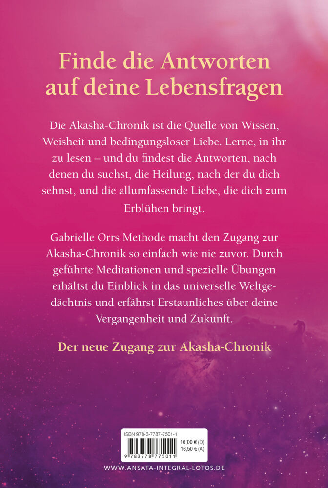 Finde die Antworten auf deine Lebensfragen Die Akasha-Chronik ist die Quelle von Wissen, Weisheit und bedingungsloser Liebe. Lerne, in ihr zu lesen und du findest die Antworten, nach denen du suchst, die Heilung, nach der du dich sehnst, und die allumfassende ...