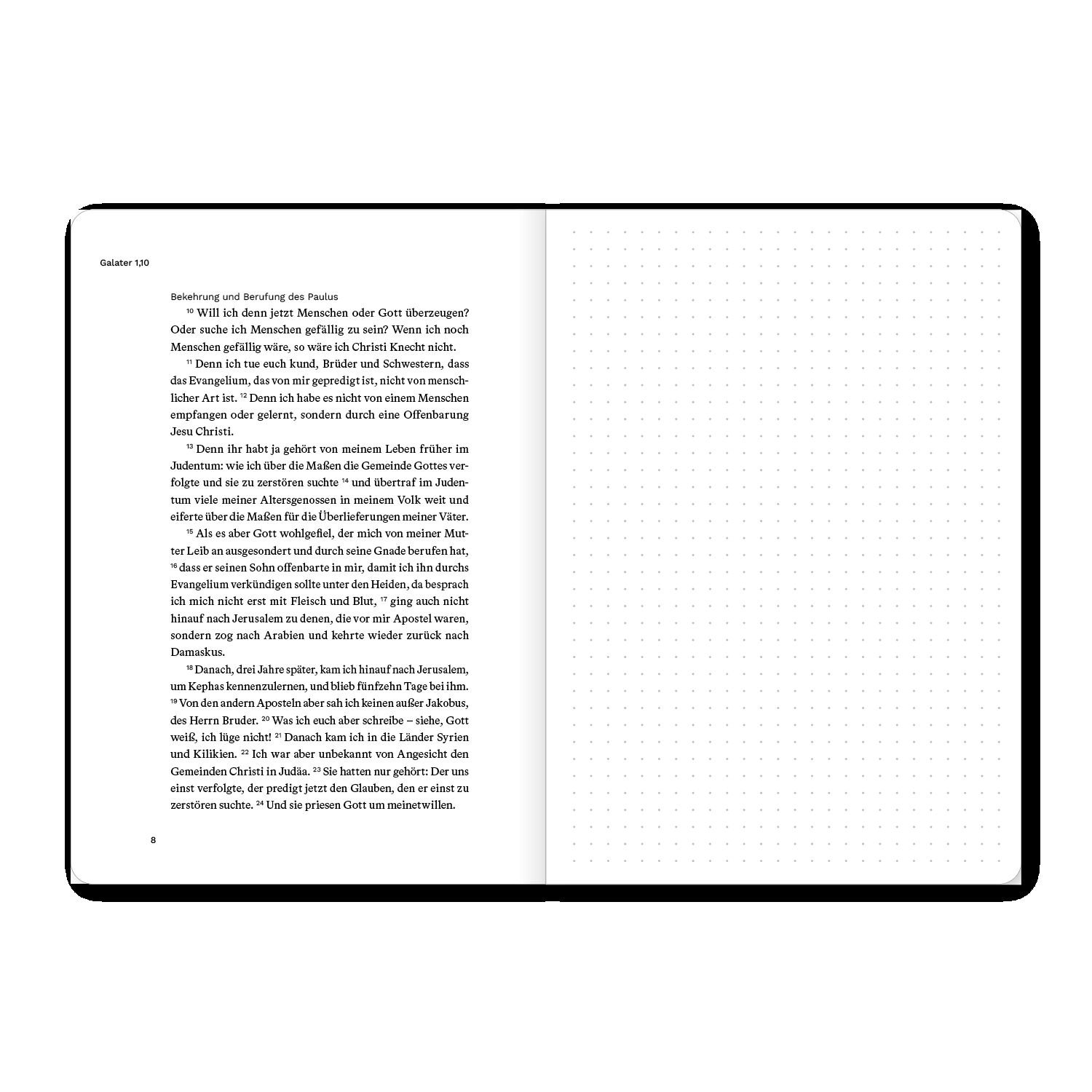 Bibeltext und Notizseite mit Punktraster ideal für die Bibellese, Kleingruppe oder Predigt. Hochwertig ausgestattet, viel Platz zum Schreiben. Dieses Bibeljournal kombiniert den vollständigen Bibeltext eines biblischen Buches (Luther 2017) und eine gegenüberli...