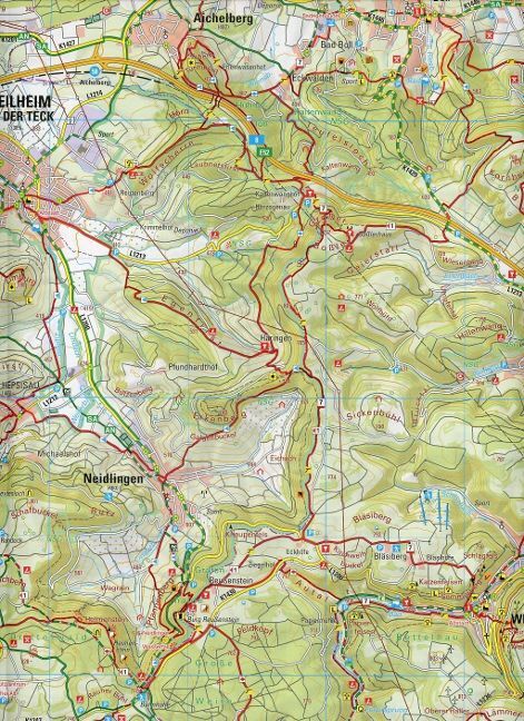 Gebiet: Holzmaden, Weilheim an der Teck, Geislingen an der Steige, Wiesensteig, Amstetten, Zainingen, Laichingen, Bermaringen, Münsingen, Mehrstetten, Schelklingen, Blaubeuren. Inhalt: In der Karte sind die wichtigen überregionalen Wanderwege, wie z.B. der Sch...
