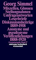Miszellen, Glossen, Stellungnahmen, Umfrageantworten, Leserbriefe, Diskussionsbeiträge 1889-1918 Notiz [über psychologische Studien in Nord-Amerika] [1889] Psychologische Glossen zur Strafgesetznovelle [1892] Ein Wort über soziale Freiheit [1892] Gerhart Hauptmanns Weber' [1893] Über Plagiate. Offener Brief an Herrn Hermann Bahr [1896] Berliner Gewerbeausstellung [1896] Der Frauenkongreß und die Sozialdemokratie [1896] Noch einmal Der Pulsschlag [Leserbrief von 1897] [Zuschrift zur Vorlesungsreszension von Ferdinand Frey: Psychologische Konsequenzen des Sozialismus, Jan. 1899] Zum Fall Schmoller [Leserbrief von 1902] [Gutachten über die Petitionen zur 'Gestattung bzw. Errichtung vollständiger Mädchengymnasien' 1903] [Umfrageantwort zu:] Wettbewerb oder Auftrag? [1904] Über die Zurechnungsfähigkeit perverser Verbrecher (1904) [Beitrag zu:] Die Zukunft der Soziologie. Eine Enquete über ihre Aussichten [1908] [Beitrag zu:] Religiöse Grundgedanken und moderne Wissenschaft. Eine Umfrage [1909] [Beitrag zu:] Die Zukunft unserer Kultur. Stimmen über Kulturtendenzen und Kulturpolitik [1909] [Umfrageantwort zu:] Zur Frage der Mädchenschulreform. [1909] [Beitrag zu:] Urteile unserer Zeitgenossen über Goethe [1909] [Redbeiträge auf dem Ersten Deutschen Soziologentag, 1910] [Umfrageantwort zu:] Unsere Gelehrten bei der Arbeit, 1911] [Umfrageantwort zu:] Frankfurter Universität und Gelehrtenwelt. Eine Umfrage bei deutschen Hochschullehrern [1912] Die Hamburgische Universität [1913] An Herrn Professor Karl Lamprecht [1913] [Beitrag zu:] Immanuel Kants Grabstätte. Eine Rundfrage der Könisgberger Hartungschen Zeitung [1914] Der Fall Jastrow [1914] "Aufklärung des Auslands" [1914] Bergson und der deutsche Zynismus' [1914] Vollendung und Aufgabe [1914] "Durch alle Fruchtbarkeit" [1915] [Beitrag zu:] Kulturarbetet efter krigets slut. Enquetesvar till Svenska Dagbladet fran Georges Clemenceau och Georg Simmel [1915] Aus einer Aphorismensammlung [1915] "Das ist das Wundervolle dieser Zeit " [1916] "Wenn die Menschen damit großtun" (1916) Eine Fastenpredigt. Von dem Opfer der Wohlhabenden (1917) "Es sind zu viele große Worte.." [1917] "Zu nichts Wichtigerem" [1917] Es ist ein noch immer verbreitetes Mißverständnis [1918] "Man hat sich an den Schutz" [1918] "Es sind zwei Dinge" [1918] Anhang I: Simmel als Mitunterzeichner von Aufrufen und Erkärungen 1903-1914 Anhang II: Einträge in Herrmann A.L. Degeners Wer ist's? Anonyme und pseudonyme Veröffentlichungen 1888-1920 Die Bauernbefreiung in Preussen [1888] Zur Psychologie des Pessimismus [1888] Die Clark-University in Worcester 1889] [Über:] Ein Weg zum Frieden [von Hermann Faber, 1889] Ueber Kunstausstellungen [1890] Ex malis minima! Reflexionen zur Prostitutinsfrage [1891] Einiges über die Prostitution in Gegenwart und Zukunft [1892] Etwas vom Spiritismus [1892] Humanistische Märchen [1892] Infelices possidentes [1893] [Über:] Die Analogie im volkstümlichen Denken. Eine psychologische Untersuchung von William Stern [1894] Professoren-Honorare [1894/95] Berliner Kunstbrief [1896] Zur Privatdocenten-Frage [1896] Frauenstudium an der Berliner Universität [Leserbrief von 1899] [Über:] Karl Joël, Karl, Professor in Basel: Philosophenwege. Ausblicke und Rückblicke. Berlin, Heyfelder 1901 [1901] "Zulassung ausländischer Studenten" [Leserbrief von 1901] "Zu der Ausländerfrage an den deutschen Universitäten... [Leserbrief von 1901] Philosophie und Psychologie [1910] Die Umwertung der Werte. Ein Wort an die Wohlhabenden [1915] Nochmals: Deutschtum und Europäertum [Leserbrief von 1916] ** Beiträge aus der Jugend 1897-1907 Herbst am Rhein [1897] Zehn Einzelheiten [1897] Jenseits der Schönheit [1897] Rosen. Eine soziale Hypothese [1897] Der Schweizer Sommer 1897. Eine Reminiszenz [1897] Das Gleichgiltigste. Ein moralisches Dilemma [1897] Weniges [1898] Theistische Phantasien eines Fin-de-siéclisten [1898] Recht. Ein Tragödien-Fragment [1898] Momentbilder sub specie aeternitatis: Gegensatz Moral Aufenthalt Beseeltheit Entsagung Reihenfolge [1899] Von erfüllten Wünschen. Zwei sehr ähnliche Märchen [1899] Klinge, kleines Frühlingslied-'. Ein Momentbild [1899] Eine Sehnsucht [1900] Metaphysik der Faulheit. Ein Satyrspiel zur Tragödie der Philosophie [1900] Momentbilder sub specie aeternitatis: Spuren im Eise Blüthenverschwendung Wenig Kuchen Kein Dichter Der Tornister [1900] Nur eine Brücke [1901] Momentbilder sub specie aeternitatis: Geld allein macht nicht glücklich Himmel und Hölle [1901] Momentbilder sub specie aeternitatis: Der Lügenmacher Die Duse [1901] Momentbilder sub specie aeternitatis: Gelbe Kühe Die Mauer des Glücks Koketterie [1901] Moralische Unterhaltungen I Und ist denn Liebe ein Verbrechen?' [1902] Moralische Unterhaltungen II. Tout comprende c'est tout pardonner [1902] Momentbilder sub specie aeternitatis: Relativität Reinheit Nur Alles [1902] Momentbilder sub specie aeternitatis: Versteigerung Rache Ausrede [1902] Momentbilder sub specie aeternitatis: Treulosigkeit Anima candida [1903] Strandgut [5.4.1906] Strandgut [3.5.1906] Fragmente aus einer Philosophie der Liebe [1907] Anonyme Selbstanzeigen 1910-1920** Editorischer Bericht Miszellen, Glossen, Stellungnahmen, Umfrageantworten, Leserbriefe, Diskussionsbeiträge 1889-1918., S. 447 Anhang I: Simmel als Mitunterzeichner von Aufrufen und Erklärungen 1903-1914. S. 47…