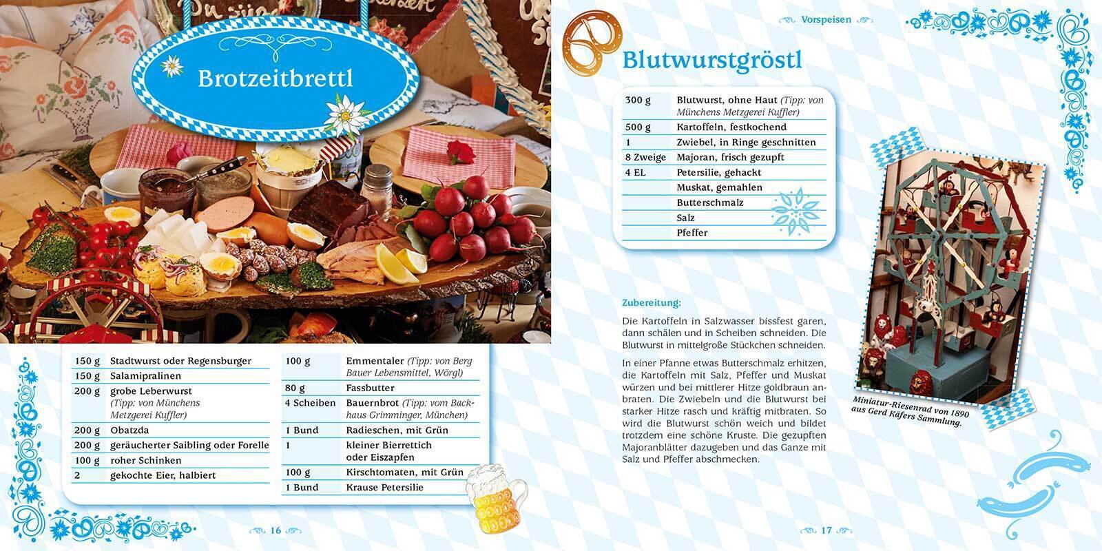 "Für mich könnt' jeden Tag Wiesn sein" - Vorwort von Gerd Käfer 4 Wiesn historisch So hat's angefangen 8 Die ältesten Fahrgeschäfte 9 Oans, zwoa, gsuffa - Bierseligkeiten 10 Das Oktoberfestbier und die sechs Münchner Brauereien 11 Öffnungszeiten 12 So schmeckt die Wiesn - Die Rezepte Vorspeisen Bayrisch Tatar 14 Brotzeitbrettl 16 Blutwurstgröstl 17 Nürnberger mit Kraut 18 Wurstsalat 20 Suppen Erdäpfelsuppe mit Regensburgern 23 Aufgeschmolzene Brotsuppe 24 Pfannkuchensuppe 26 Schwammerlsuppe 28 Bayrische Fischsuppe 30 Hauptgerichte Wiesn-Hendl mit Kartoffelsalat 32 Ente vom Grill 34 Kalbshaxe mit Semmelknödeln und Bayrisch Kraut 36 Saures Lüngerl 39 Weißwurst 40 Rescher Schweinebauch 42 Saibling in Pergamentpapier 44 Hauptgerichte Vegetarisch Kartoffelgemüse mit Kräuterseitlingen 47 Bayrische Kasspatzn 48 Desserts Himbeer- und Heidelbeernocken 51 Bayrisch Creme mit Beeren und Sabayon 52 Vanilleeis 54 Apfelkiachl 55 Kaiserschmarrn mit Zwetschgen-Röster 56 Schokoladenpudding 58 Mohnbuchteln 60 Grundrezepte Rinderconsommé 62 Entenjus 63 Kartoffelknödel 64 Gerd Käfers Tipps für Ihre Wiesn daheim 65 Gerd Käfers Wiesn-ABC 68 Wiesn-Blitzkurs auf Bayrisch 76 Die Autoren 77 Schlusswort 80