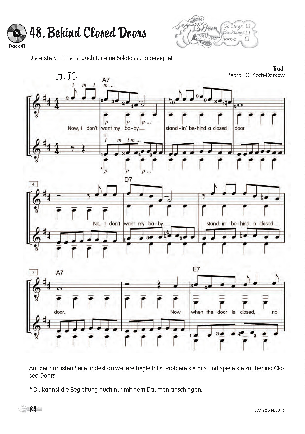 Liebe Eltern, liebe Gitarrenlehrerinnenund Gitarrenlehrer,der hier vorgelegte 3. Band komplettiert dasLehrwerk Moro und Lilli. Darüber hinaus eigneter sich aber auch als Ergänzung zu bzw. Fortsetzungvon anderen Kindergitarrenschulen.Das bewährte Prinzip von kleinen, ausführlichbehandelten Lernschritten mit viel Übungsmaterialund Spielliteratur ist konsequent fortgeführtworden. Natürlich sind die Anforderungen andie Schülerinnen und Schüler dem Alter entsprechendgewachsen. Die Stücke, die aus dem normalenSchwierigkeitsgrad etwas herausfallen,sind mit einem Topleistungspunkt versehen,um die Schüler zusätzlich zu motivieren.Der Band ist in drei große Kapitel aufgeteilt:Teil A: Das zweistimmige Spiel mitgegriffenen BässenTeil B: Der freie Anschlag (Tirando)Teil C: Das LagenspielGrundsätzlich ist es ratsam, die einzelnen Kapitelnacheinander durchzuarbeiten, da sie sichaufeinander beziehen. Schüler mit höherer Leistungsbereitschaftkönnen aber auch zwei großeThemen parallel erarbeiten (z. B. das zweistimmigeSpiel mit gegriffenen Bässen und Tirando).Die Lerninhalte reichen von der Erweiterung desTonraumes bis zum XII. Bund über AufschlagsundAbzugsbindungen und Powerakkorde biszur Blues-Improvisation. Sie werden mit Aufgaben- und Rätselseiten, viel Solospielliteratur undeinigen Gitarrenduos und -trios vertieft. Die Stilistikist breit angelegt, um den Schülern einenweiten Einblick in die Gitarrenmusik zu ermöglichen.Vielen Schülerwünschen entsprechend,ist dabei ein besonderes Augenmerk auf dieGrundlagen der Popularmusik gelegt worden.So können einige Kapitel durchaus auch auf einerE-Gitarre gespielt werden, um dem Schülerso ein Nebeneinander von akustischer Gitarreund E-Gitarre nahe zu bringen.Um allen Schülern das Verfolgen und Mitspielenmit der Begleit-CD zu ermöglichen, ist diese von einigen Ausnahmen abgesehen in einemlangsamen Übetempo eingespielt worden. DieMelodie- und Begleitstimmen sind scharf kanalgetrenntabgemischt. Durch den Balancereglerist so ein Ein- und Ausblenden der Stimmenmöglich. Ist eine dritte Stimme vorhanden, so istsie in der Mitte platziert. Auf Wiederholungenmusste aus Platzgründen weitgehend verzichtetwerden.Das Spielen der Schülerinnen und Schüler zu derBegleit-CD bedarf in den meisten Fällen einerAnleitung und Motivation durch den/die Lehrer/in.Gerhard Koch-Darkow Hallo, liebe Gitarrenschülerin,hallo, lieber Gitarrenschüler!Toll, dass du schon so weit mit dem Gitarrenspielvoran gekommen bist! Lilli, der RhytmusspezialistDragon und ich begleiten dich auch durchdiesen 3. Band unserer Gitarrenschule, in derdu viele spannende Lieder, neue Akkorde undSpieltechniken kennen lernst. Du kannst dich aufklassische Spielstücke, Pop-, Rock- und Blues-Songs, Folklore aus vielen Ländern, Flamencound Fingerpicking-Stücke freuen. Erfolg hast dunatürlich dann, wenn du fl eißig und möglichsttäglich übst. Aber das kennst du ja schon alsalter Gitarrenhase.Die Bewertungspunkte haben sich ein weniggeändert. Anstelle der drei Gesichter, die du inden ersten beiden Bänden immer zum Lachenbringen musstest, gibt es im 3. Band eine Grafi kmit drei Kästchen zum Ankreuzen. Nach deinemVorspiel entscheidet der Lehrer, ob dein Spiel erstfür zu Hause reicht (Kreuz bei Home), immerhinschon für das Spiel hinter der Bühne (Kreuzbei Backstage), oder ob dein musikalischerVortrag bühnenreif ist (Kreuz bei On Stage).Zusätzlich gibt es bei einigen Stücken noch denToplleistungsdaumen, wenn der Schwierigkeitsgradhöher ist und besonderer Übeeinsatzvon dir verlangt wird. Aber nun genug geplaudert. Saiten strammziehen und viel Spaß beimSpielen!Dein Moro