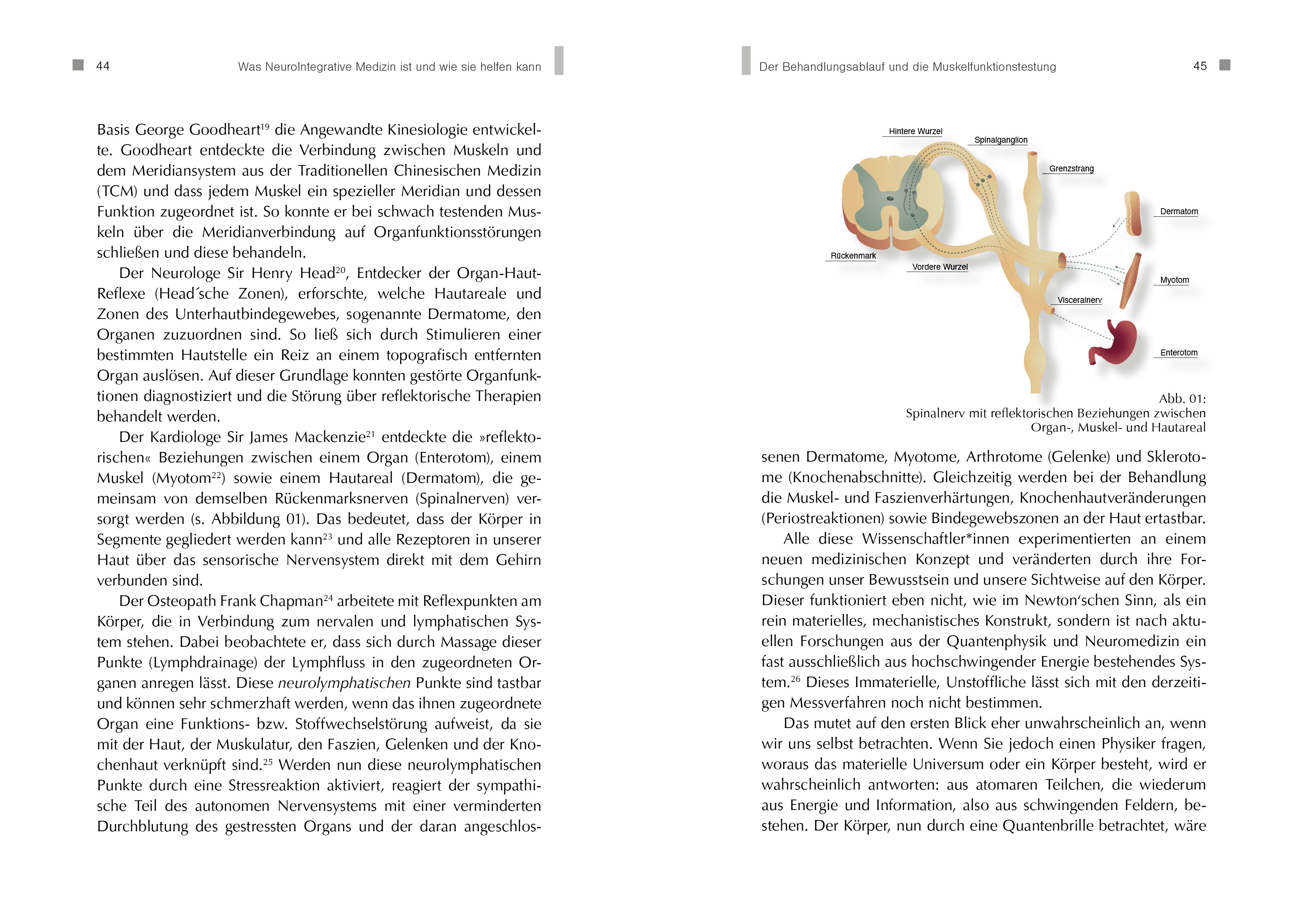 NeuroIntegrative Medizin: Eine Therapieform, die uns helfen kann, aus eigener Kraft gesund zu werden Berührung ist der feinste und sich am frühesten entwickelnde Sinn des Menschen. Die NeuroIntegrative Medizin, kurz NIM, setzt die Kraft der Berührung gezielt dazu ein, um über das Nervensystem mit dem Körpergeschehen zu interagieren. Das Ziel ist, gesundheitsfördernde Informationen an die Körpersysteme weiterzuleiten, um uns wieder in Balance mit uns und unserer Umwelt zu bringen. Grundlegend für diese Körperarbeit ist die Annahme, dass der Körper zur Selbstheilung fähig ist. Dabei werden Beschwerden als Störungen in der Kommunikation zwischen Gehirn und den betreffenden Körperbereichen verstanden. Die NeuroIntegrative Medizin nutzt diese kommunikative Verbindung, um unsere Selbstheilungskräfte zu aktivieren, indem die »missverständlichen« Signale so umgestaltet werden, dass sie vom Körper wieder »störungsfrei« verstanden werden. Behandelt wird manualtherapeutisch, d. h. mit den Händen. Da die Haut unser größtes Sinnesorgan ist, werden darüber an bestimmten, anatomisch definierten Körperpunkten gezielt Reize gesetzt und mittels eines Muskelfunktionstests die Regelkreise des Körpers überprüft. Die NeuroIntegrative Medizin verbindet alte Weisheiten des Ayurveda und der Traditionellen Chinesischen Medizin (TCM) mit ihrer Akupunkturlehre und der Kenntnis um die Energieumläufe im Körper, mit dem Wissen aus der angewandten Kinesiologie, der Lehre der Physiologie1 sowie den Erkenntnissen der Quantenphysik und der konventionellen Medizin mit allen ihren Grundlagen. Diese faszinierenden Aspekte der Methode der NeuroIntegrativen Medizin möchten wir, die Autorinnen, Ihnen in diesem Buch näherbringen und Ihnen die Behandlungsansätze und die Chancen aufzeigen, die dieses rein manuelle Behandlungskonzept bietet. Damit wollen wir Ihnen auch Mut machen, zu einer angeratenen OP in einer nicht lebensbedrohlichen Krankheitssituation Nein zu sagen oder sich nicht mit einer langjährigen Medikamenteneinnahme abzufinden, wenn schulmedizinisch keine Diagnose gestellt werden kann. Die Selbstheilungskräfte des Körpers zu aktivieren und für den gesundheitsfördernden Umgang mit den Beschwerden zu nutzen, ist immer eine Chance. NeuroIntegrative Medizin kann für sich allein oder in Kombination mit anderen Therapien angewandt werden. Die Behandlung ist sicher, schmerzfrei und nicht-invasiv in der Anwendung. So können Menschen jeden Alters mit akuten und chronischen Beschwerden behandelt werden.