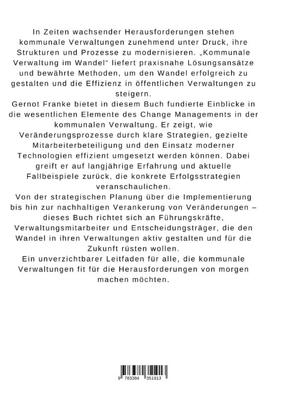 In Zeiten wachsender Herausforderungen stehen kommunale Verwaltungen zunehmend unter Druck, ihre Strukturen und Prozesse zu modernisieren. Kommunale Verwaltung im Wandel liefert praxisnahe Lösungsansätze und bewährte Methoden, um den Wandel erfolgreich zu gest...