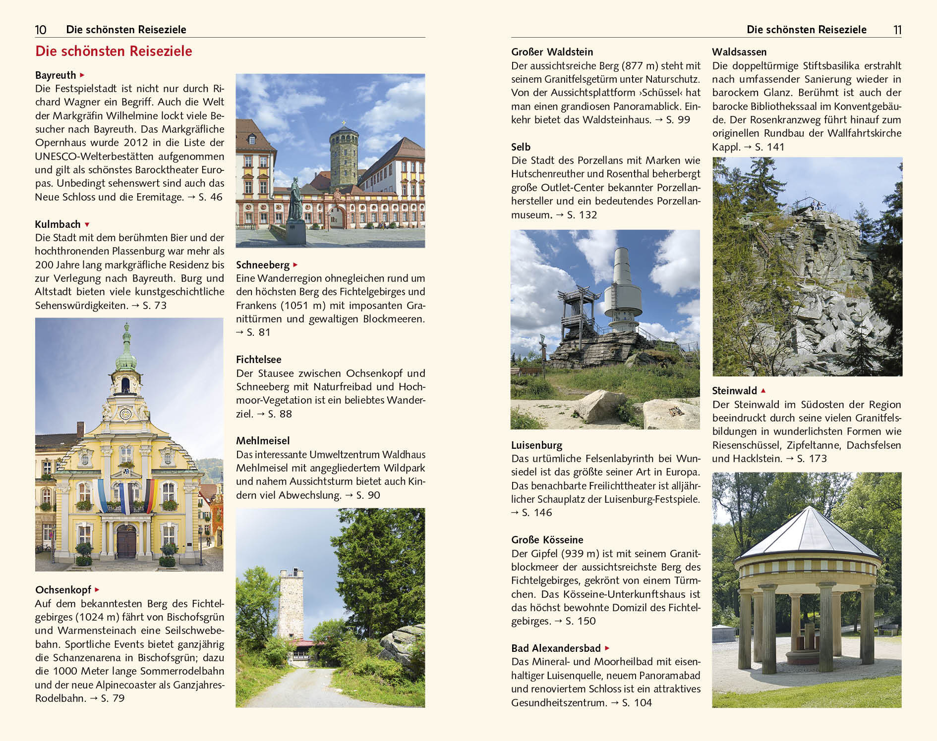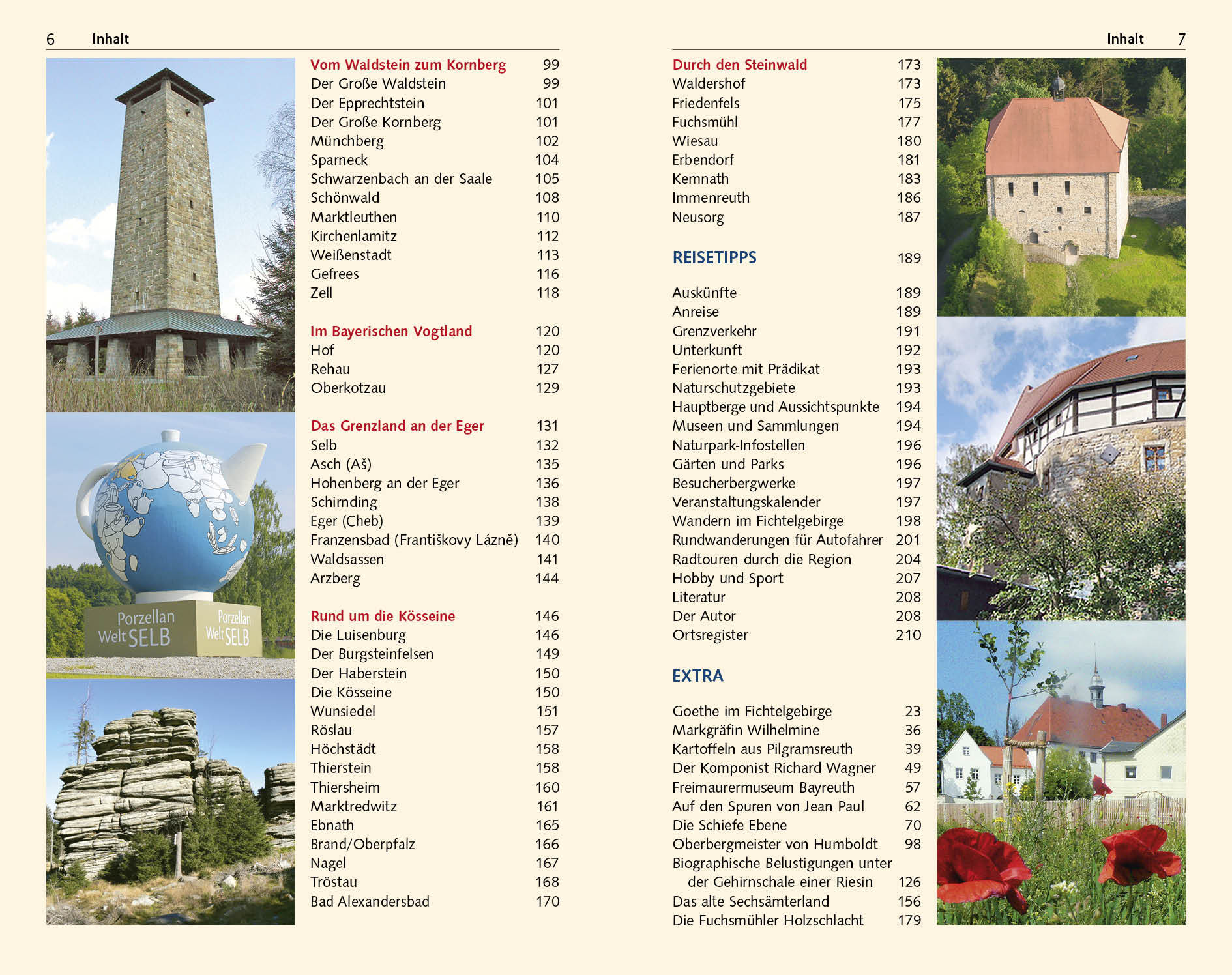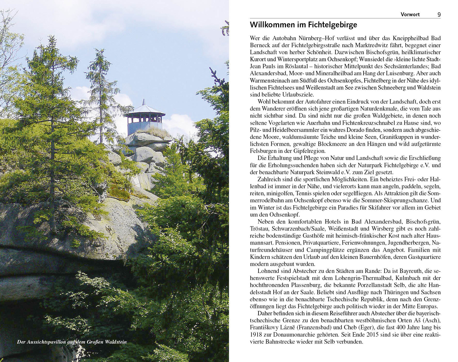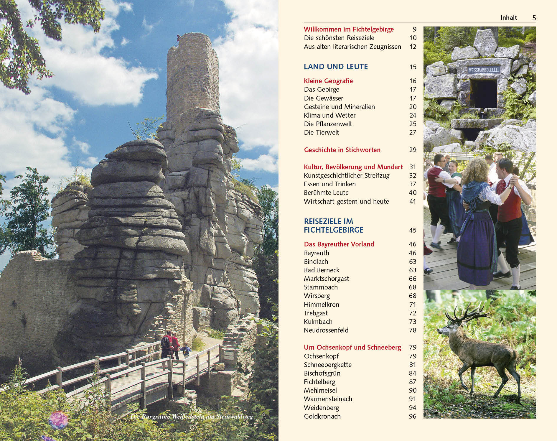 Wer die Autobahn Nürnberg-Hof verlässt und über das Kneippheilbad Bad Berneck auf der Fichtelgebirgsstraße nach Marktredwitz fährt, begegnet einer Landschaft von herber Schönheit. Dazwischen Bischofsgrün, heilklimatischer Kurort und Wintersportplatz am Ochsenkopf; Wunsiedel die kleine lichte Stadt" Jean Pauls im Röslautal - historischer Mittelpunkt des Sechsämterlandes; Bad Alexandersbad, Moor- und Mineralheilbad am Hang der Luisenburg. Aber auch Warmensteinach am Südfuß des Ochsenkopfes, Fichtelberg in der Nähe des idyllischen Fichtelsees und Weißenstadt am See zwischen Schneeberg und Waldstein sind beliebte Urlaubsziele. Wohl bekommt der Autofahrer einen Eindruck von der Landschaft, doch erst dem Wanderer eröffnen sich jene großartigen Naturdenkmale, die vom Tale aus nicht sichtbar sind. Da sind nicht nur die großen Waldgebiete, in denen noch seltene Vogelarten wie Auerhahn und Fichtenkreuzschnabel zu Hause sind, wo Pilz- und Heidelbeersammler ein wahres Dorado finden, sondern auch abgeschiedene Moore, waldumsäumte Teiche und kleine Seen, Granitkuppen in wunderlichsten Formen, gewaltige Blockmeere an den Hängen und wild aufgetürmte Felsburgen in der Gipfelregion.Die Erhaltung und Pflege von Natur und Landschaft sowie die Erschließung für die Erholungssuchenden haben sich der Naturpark Fichtelgebirge e.V. und der benachbarte Naturpark Steinwald e.V. zum Ziel gesetzt.Zahlreich sind die sportlichen Möglichkeiten. Ein beheiztes Frei- oder Hallenbad ist immer in der Nähe, und vielerorts kann man angeln, paddeln, segeln, reiten, minigolfen, Tennis spielen oder segelfliegen. Als Attraktion gilt die Sommerrodelbahn am Ochsenkopf ebenso wie die Sommer-Skisprungschanze. Und im Winter ist das Fichtelgebirge ein Paradies für Skifahrer vor allem im Gebiet um den Ochsenkopf.Neben den komfortablen Hotels in Bad Alexandersbad, Bischofsgrün, Tröstau, Schwarzenbach/Saale, Weißenstadt und Wirsberg gibt es noch zahlreiche bodenständige Gasthöfe mit heimisch-fränkischer Kost nach alter Hausmannsart. Pensionen, Privatquartiere, Ferienwohnungen, Jugendherbergen, Naturfreundehäuser und Campingplätze ergänzen das Angebot. Familien mit Kindern schätzen den Urlaub auf den kleinen Bauernhöfen, deren Gastquartiere modern ausgebaut wurden.Lohnend sind Abstecher zu den Städten am Rande: Da ist Bayreuth, die sehenswerte Festspielstadt mit dem Lohengrin-Thermalbad, Kulmbach mit der hochthronenden Plassenburg, die bekannte Porzellanstadt Selb, die alte Handelsstadt Hof an der Saale. Beliebt sind Ausflüge nach Thüringen und Sachsen ebenso wie in die benachbarte Tschechische Republik, denn nach den Grenzöffnungen liegt das Fichtelgebirge auch politisch wieder in der Mitte Europas.Daher befinden sich in diesem Reiseführer auch Abstecher über die bayerisch-tschechische Grenze zu den benachbarten westböhmischen Orten As (Asch), Frantiskovy Lázn_ (Franzensbad) und Cheb (Eger), die fast 400 Jahre lang bis 1918 zur Donaumonarchie gehörten. Seit Ende 2015 sind sie über eine reaktivierte Bahnstrecke wieder mit Selb verbunden.>>> Weitere Reiseführer zu interessanten Regionen in Deutschland finden Sie auf der Website des Trescher Verlags.