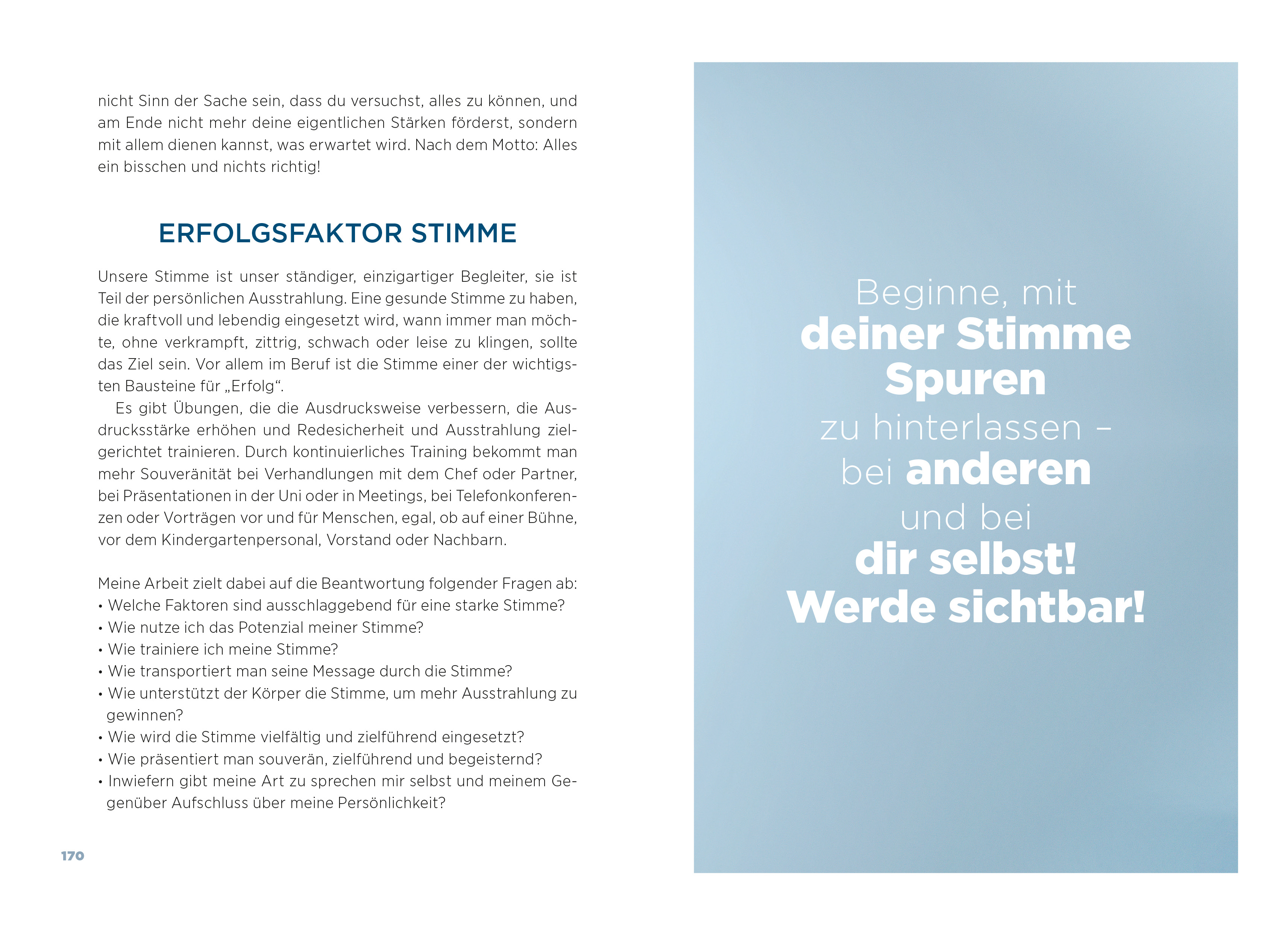 Starke Stimme starker Auftritt: Unsere Stimme ist der Spiegel unserer Seele. Sie hat großen Einfluss darauf, wie unsere Umwelt uns wahrnimmt. Habe ich überhaupt eine Stimme? Was habe ich der Welt zu sagen? Wie verschaffe ich mir Gehör? Wer bin ich? Was sagt m...