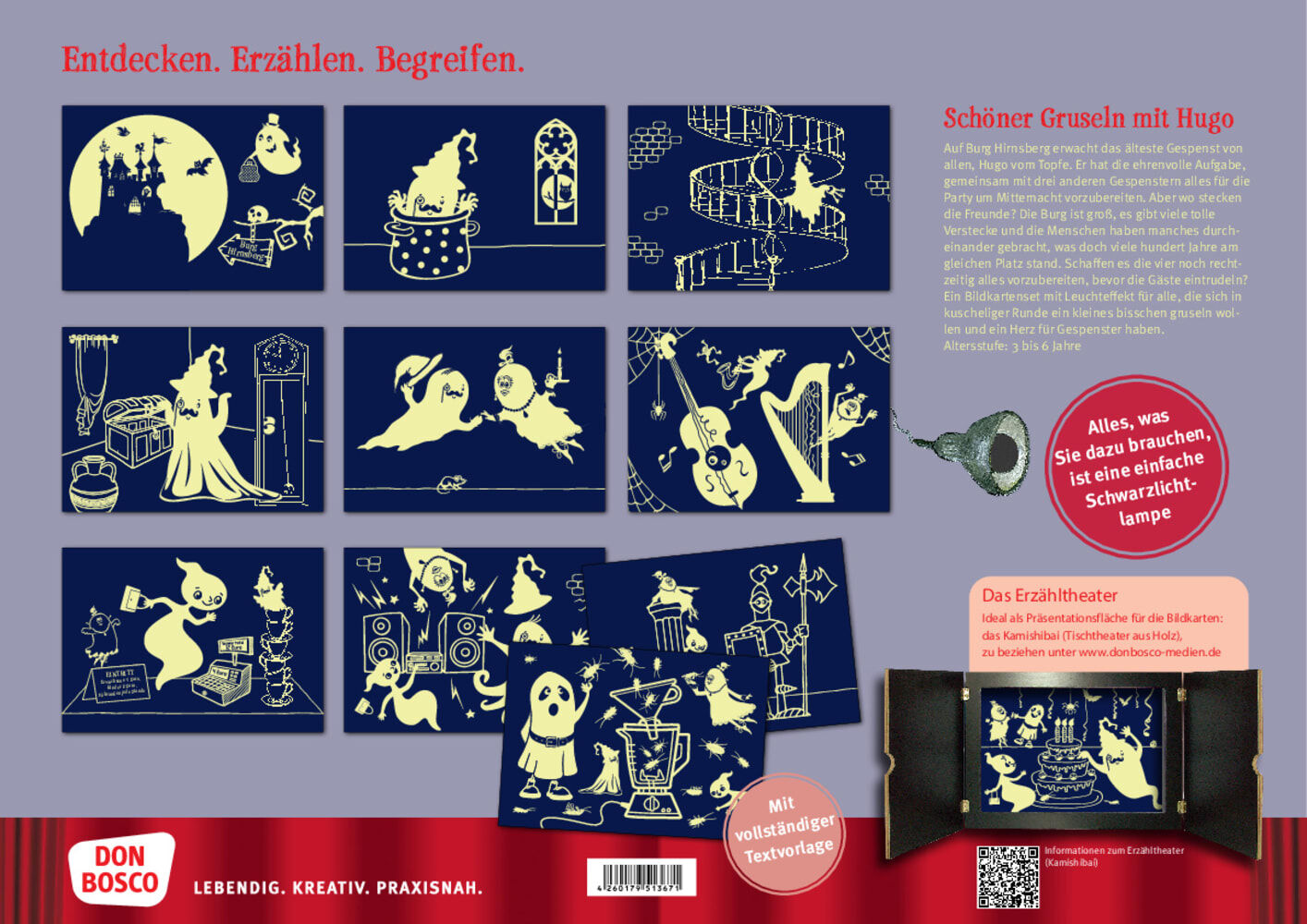 Der 963-jährige Hugo vom Topfe will zusammen mit drei anderen Gespenstern alles für die große Party vorbereiten. Aber wo stecken sie bloß? Die Bildkarten leuchten bei Schwarzlicht. Auf der alten Burg Hirnsberg erwacht Hugo vom Topfe. Er ist mit 963 Jahren der ...