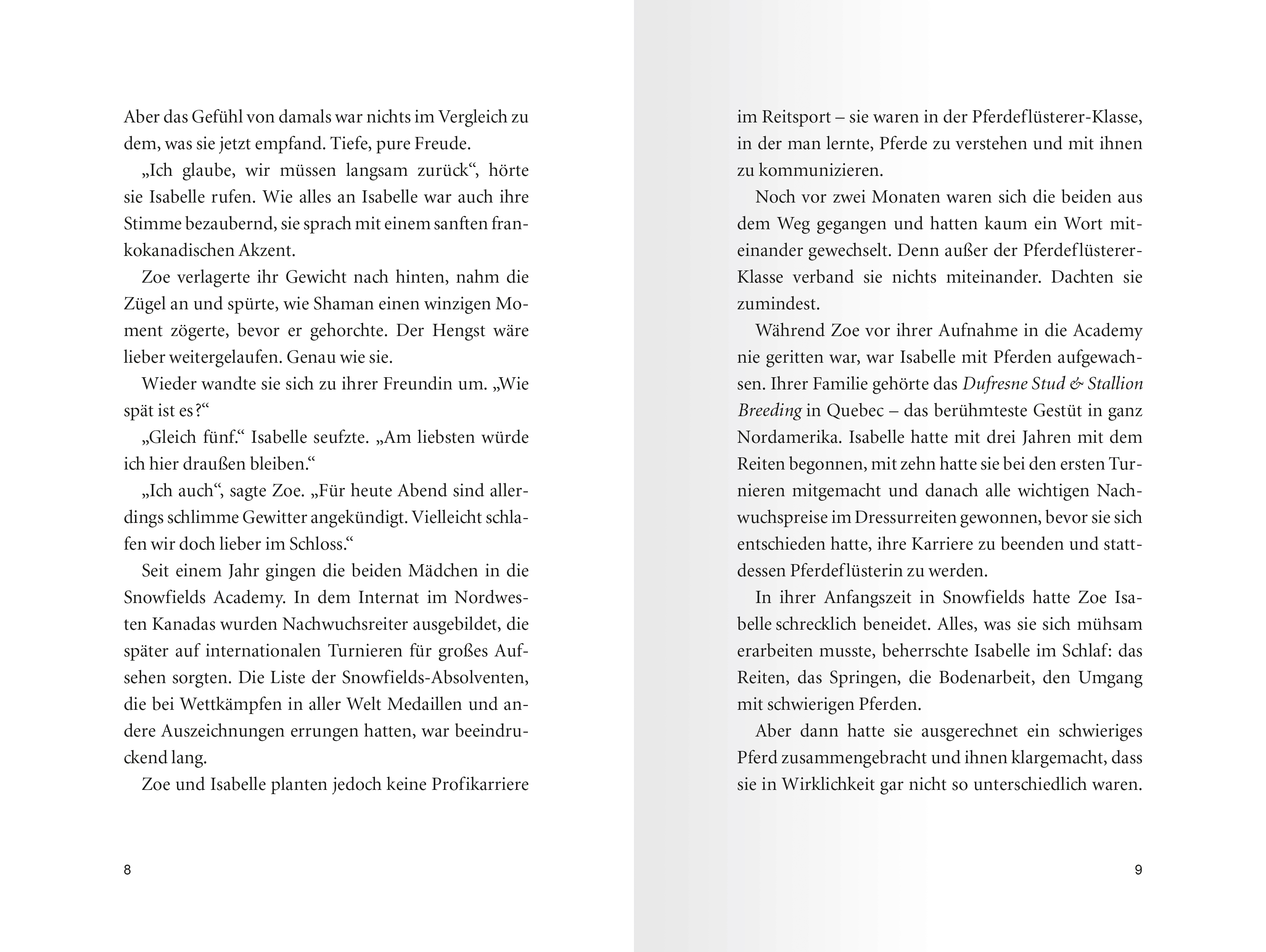 Im wilden Kanada steht ein weißes Schloss: Snowfields. Auf dem Internat werden die weltbesten Reiter ausgebildet und verletzte Pferdeseelen geheilt. Zoe macht sich Sorgen um ihre Mitschülerin Cathy. Das Mädchen lässt niemanden an sich heran und steht kurz davo...