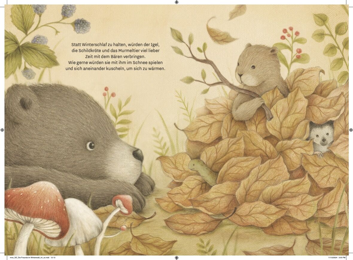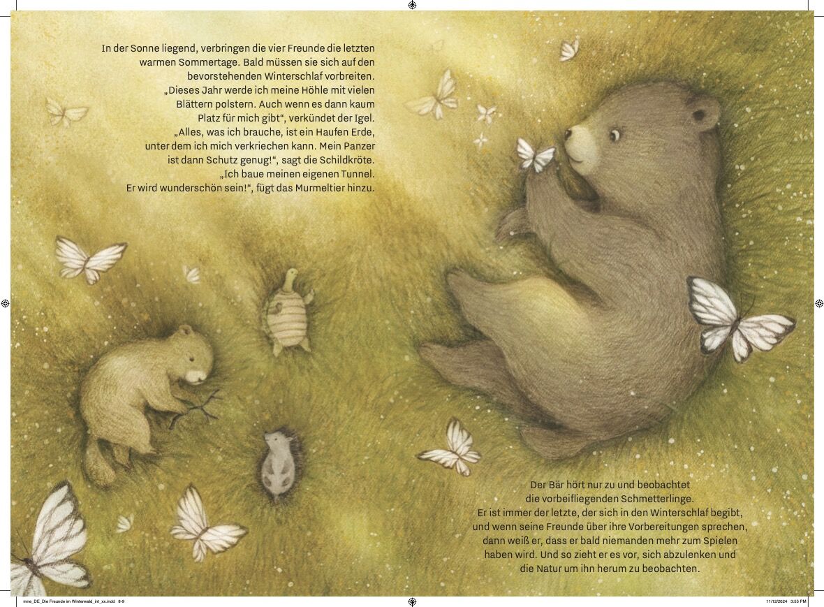 Der Bär, der Igel, die Schildkröte und das Murmeltier begeben sich in ihren Winterschlaf. Als ein Sturm ihren Unterschlupf zerstört, bringt der Bär alles wieder für sie in Ordnung. Doch bevor er sich in seine warme Höhle zurückziehen kann, schläft er draußen i...