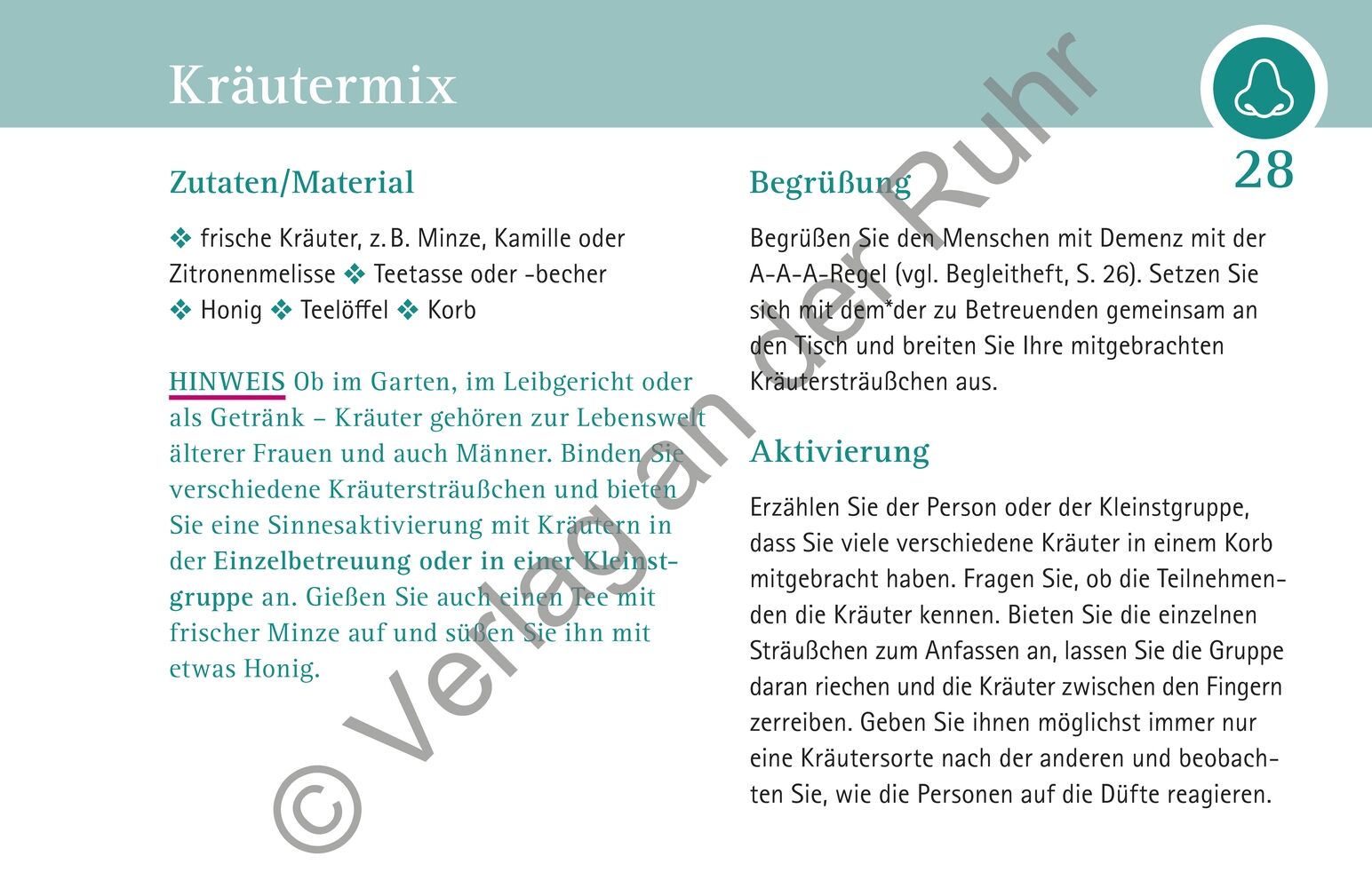 Karten-Set zur Sinnesaktivierung von Menschen mit fortgeschrittener und schwerer Demenz für Fachkräfte in der Altenpflege, Demenzbetreuung und Seniorenarbeit sowie für betreuende Angehörige zu Hause +++ Alle Sinne aktivieren Dieses Karten-Set bietet 30 sensib...
