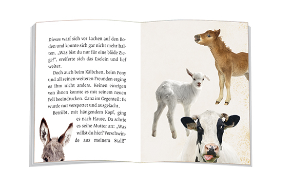 Der kleine Esel fühlt sich nicht mehr wohl. Er ist es leid, nur grau zu sein und wäre viel lieber weiß wie Schnee. Er wälzt sich in weißer Farbe und stellt sich voller Stolz seinen Freunden vor. Doch weder das Schaf, das Zicklein, das Pony noch das Kälbchen er...