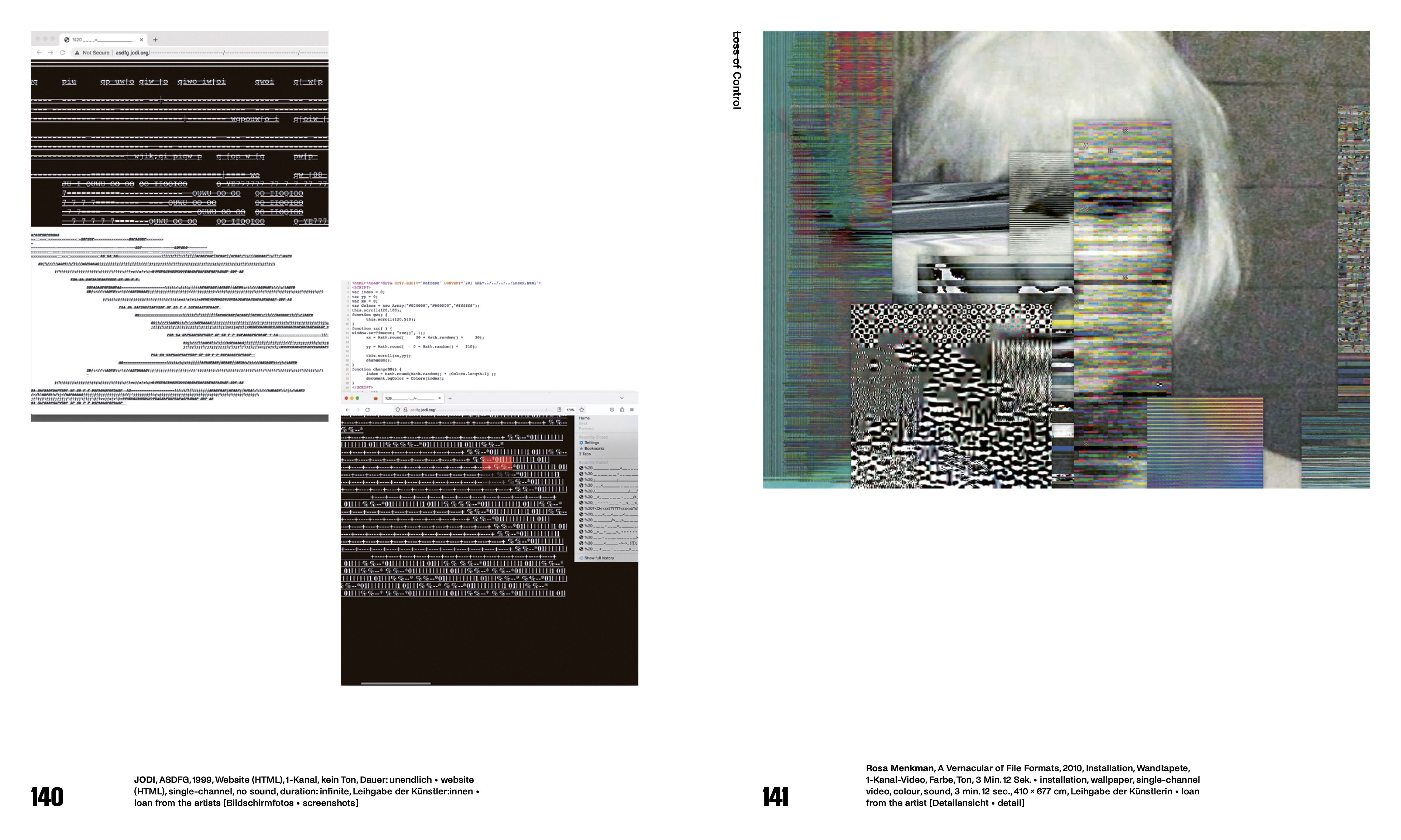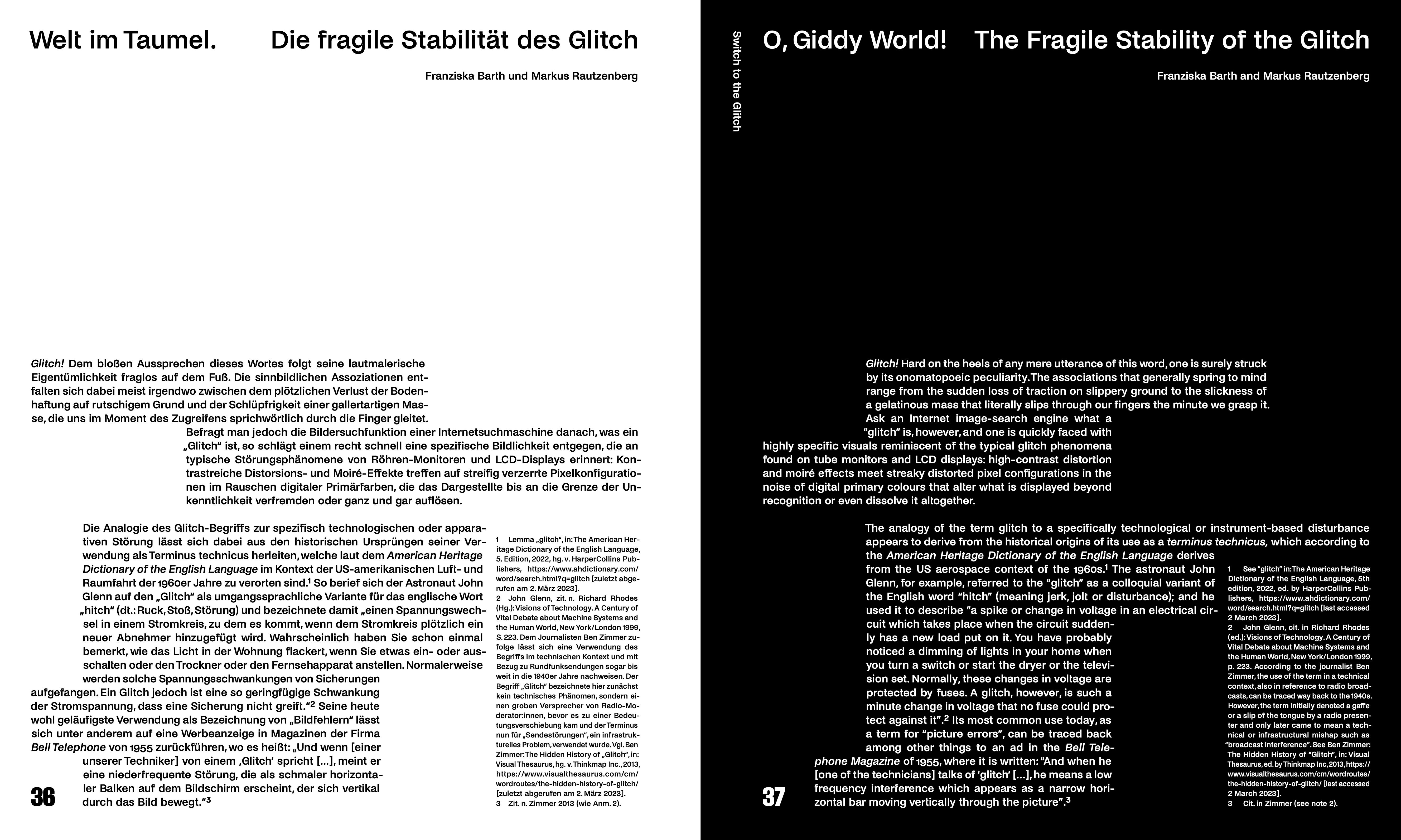 The catalogue Glitch. The Art of Interference is the first comprehensive survey with a historical derivation of the potential of glitches in art, media, and society. With works by Maya Dunietz, Jake Elwes, JODI, Joan Jonas, Germaine Krull, Ryoichi Kurokawa, Mame-Diarra Niang, Carsten Nicolai, Kazuma Obara, Nam June Paik, Jiang Pengyi, Sondra Perry, Man Ray, Pipilotti Rist, Steina Vasulka, amongst others, alongside with historical magazines and guidebooks on how to avoid photographic errors as counter narrative. In essays and free-forming writings, Franziska Barth and Markus Rautzenberg, Nick Briz, Doris Gassert, Ute Holl, Justyna Janik, Franziska Kunze, Rosa Menkman, Mame-Diarra Niang, and Agnieszka Roguski provide broader insights into the recent fields of research on the global phenomenon of glitch art.