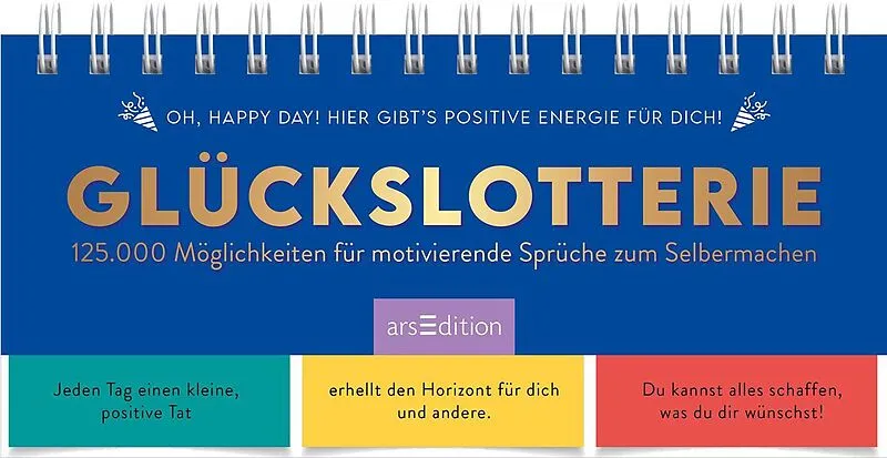 Motivierende Sprüche selbst generieren Manchmal braucht man einfach einen motivierenden Spruch oder einen positiven Denkanstoß, um den Alltag etwas aufzuhellen. Genau dafür gibt es die Glückslotterie, einen Tischaufsteller mit 3 Teilen zum Umklappen, aus dene...