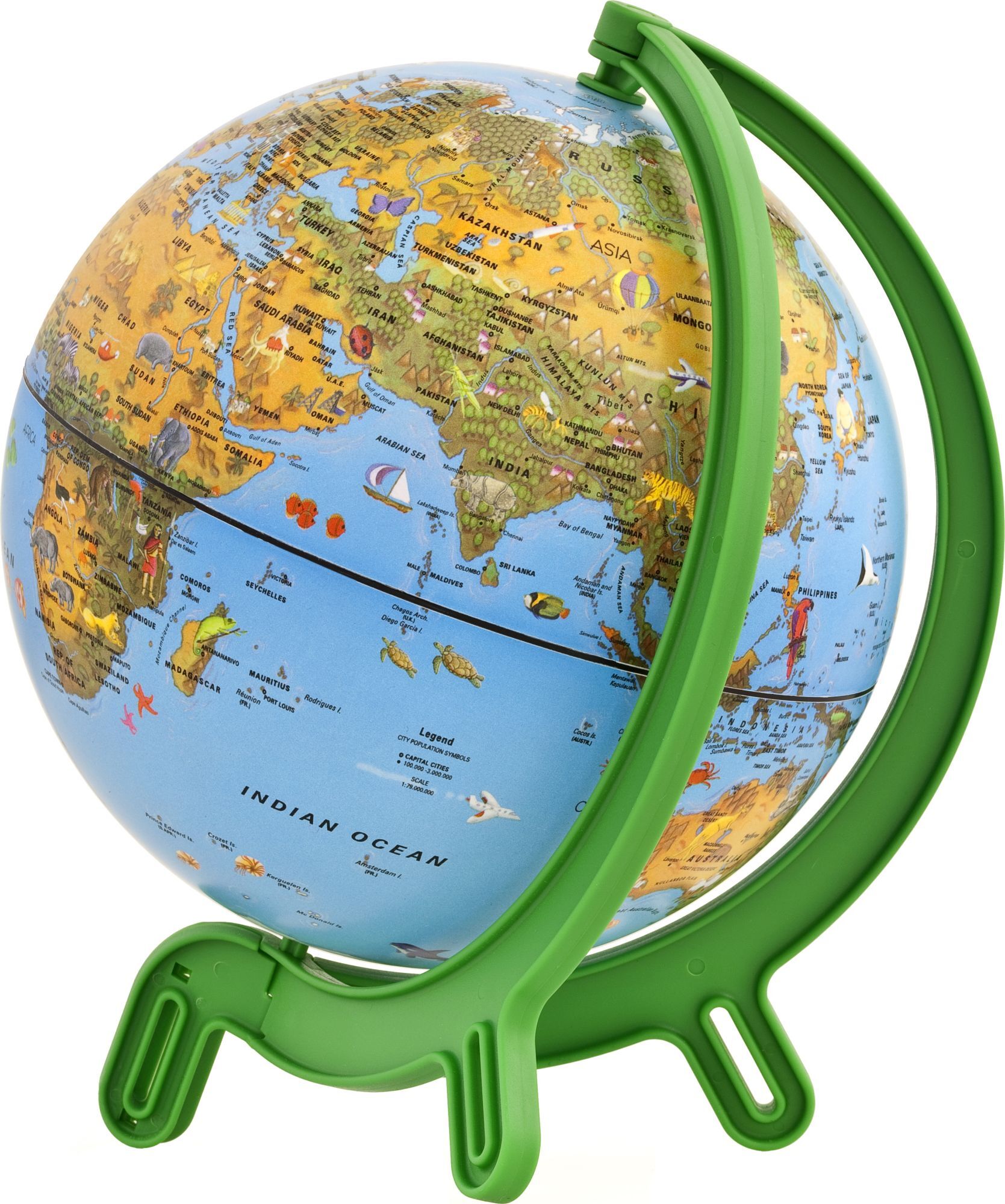 GMG 16, Miniglobus für Kinder. Grünes zweireihiges Kunststoffgestell, Physische Kartografie mit kindgerechten Abbildungen (Tiere, Bauwerke, Technik) in deutscher Sprache. 16 cm Durchmesser, unbeleuchtet.