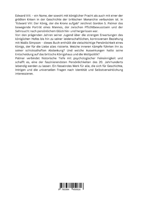 Edward VIII. ein Name, der sowohl mit königlicher Pracht als auch mit einer der größten Krisen in der Geschichte der britischen Monarchie verbunden ist. In "Edward VIII: Der König, der die Krone aufgab" zeichnet Gordon S. Palmer das bewegende Porträt eines Man...