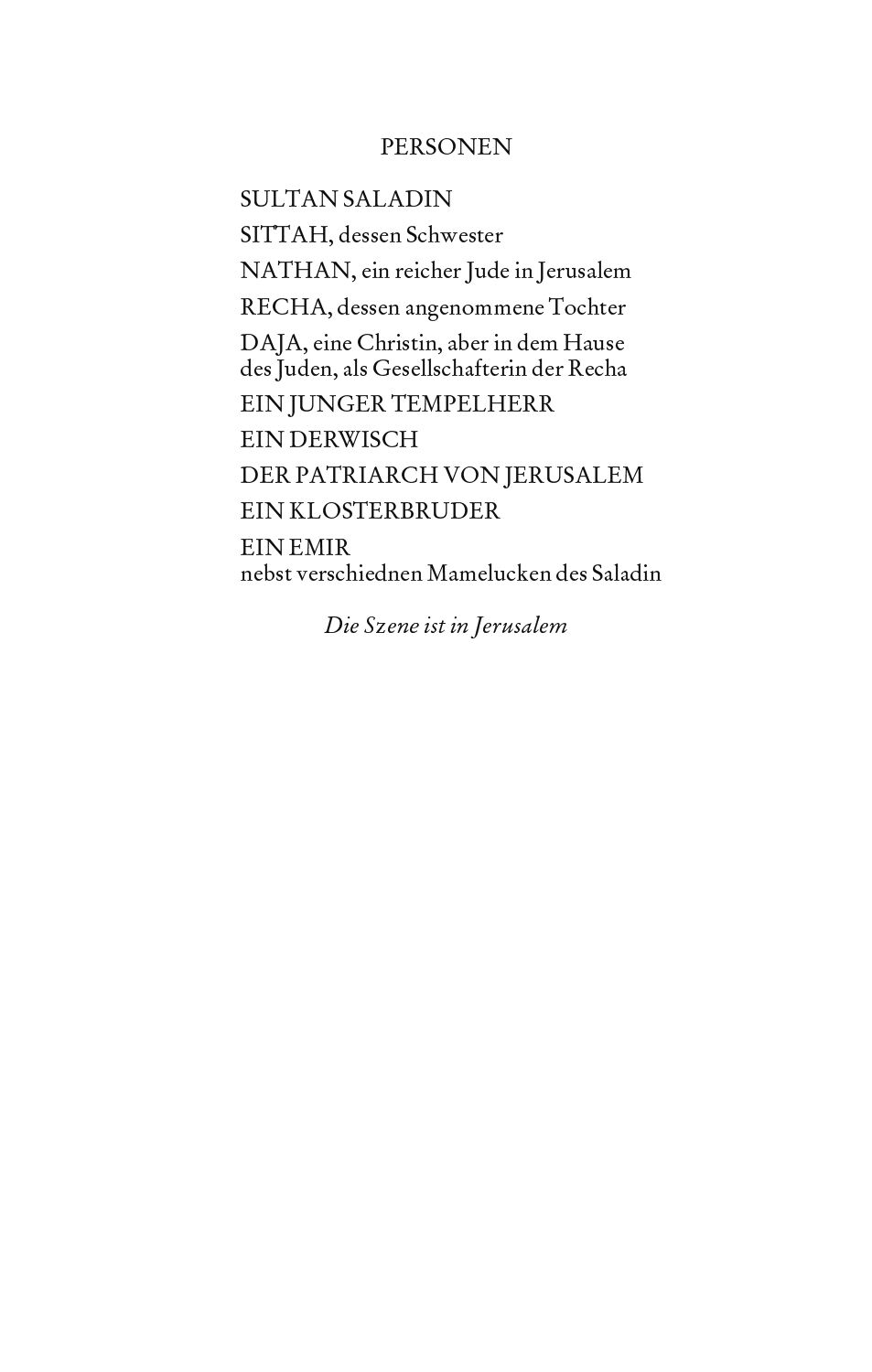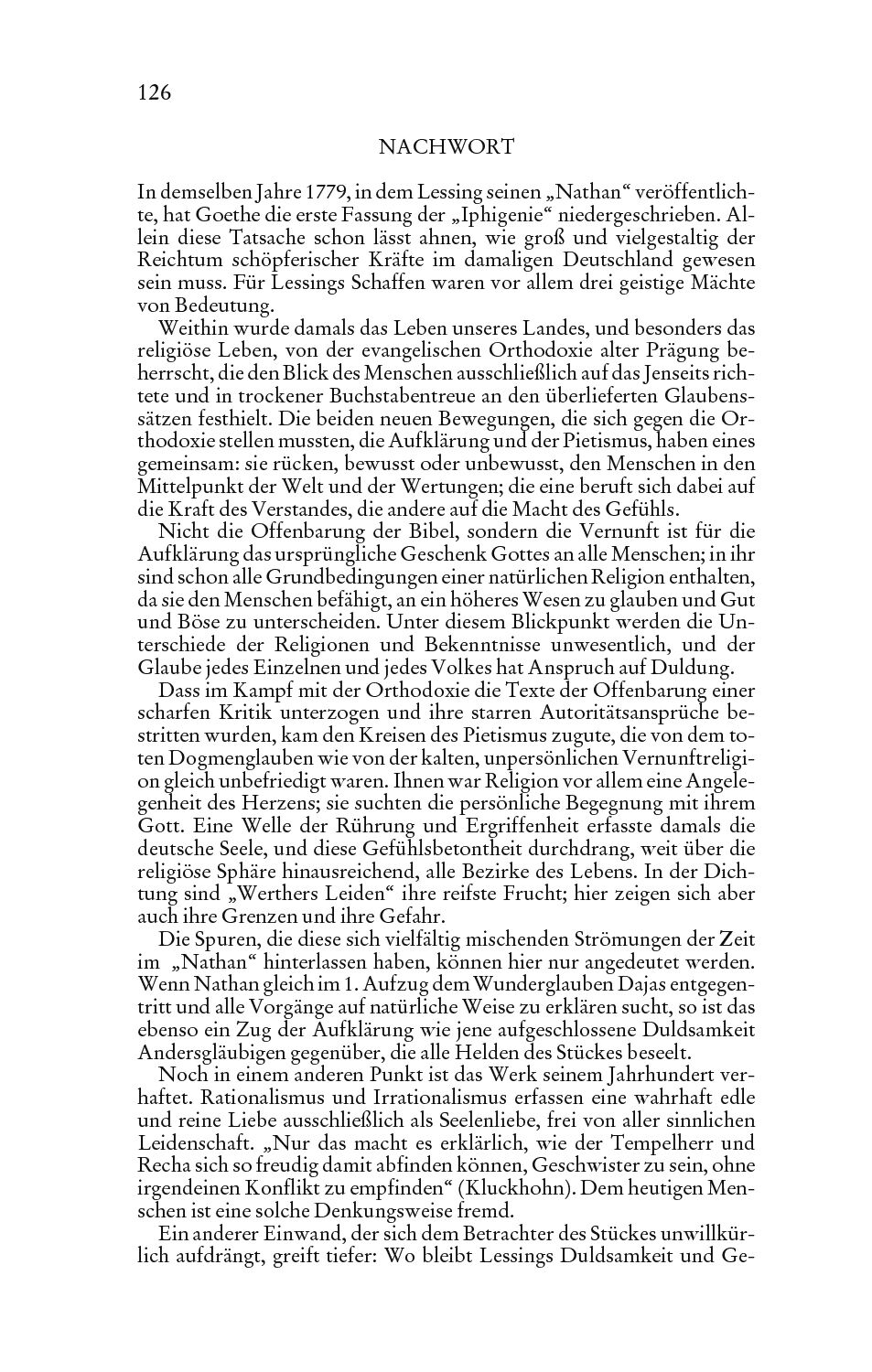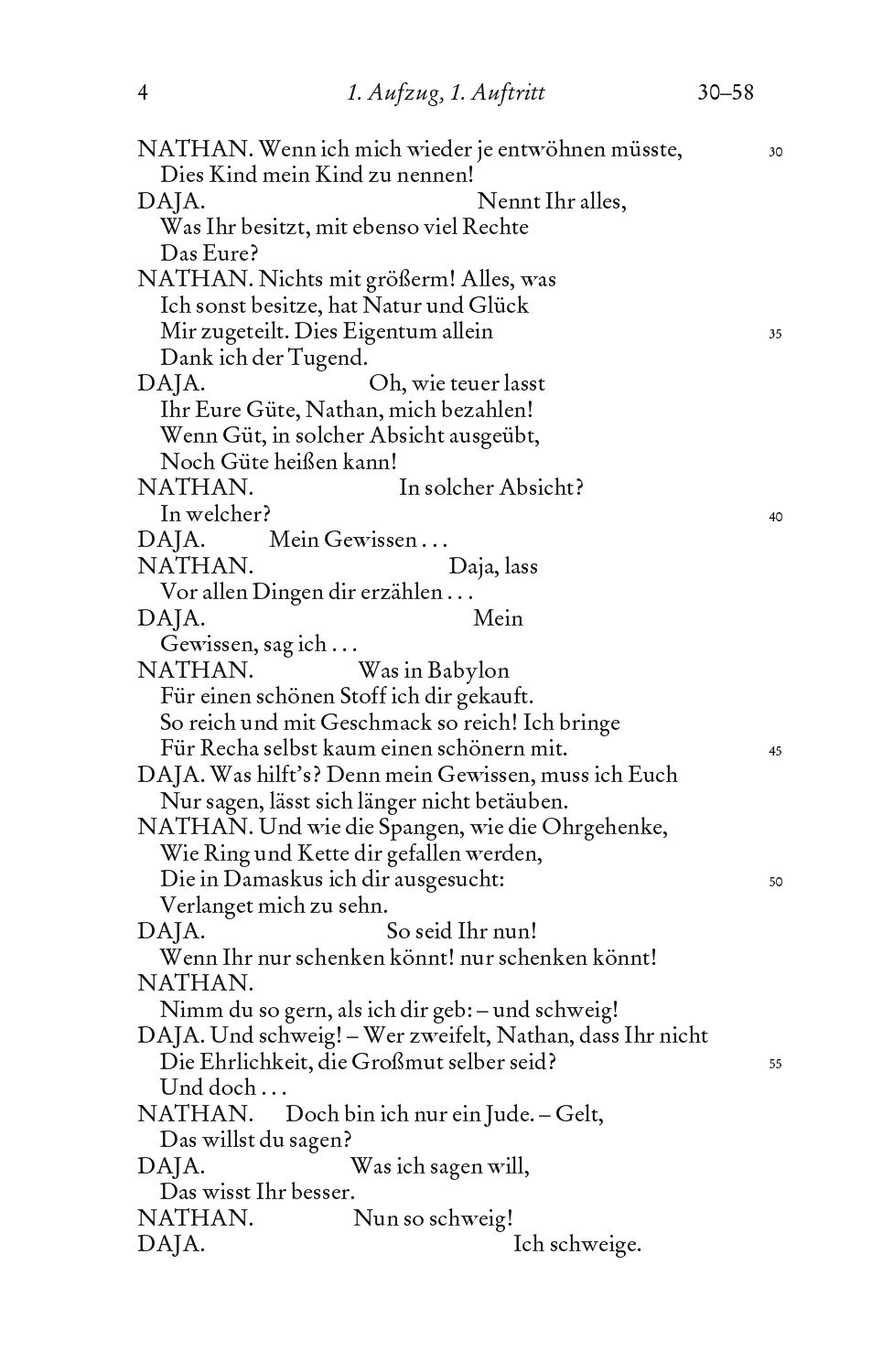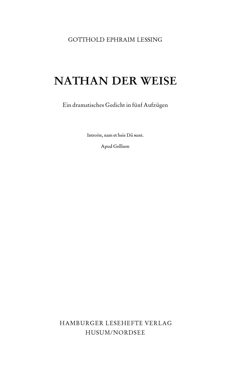 Kernstück dieser Dichtung ist die "Parabel von dem Ring", dessen Besitz den Erben der wahren Religion kenntlich machen soll. Lessing will im "Nathan" zeigen, dass "nicht die Wahrheit, in deren Besitz ein Mensch ist oder zu sein vermeint, sondern die aufrichti...